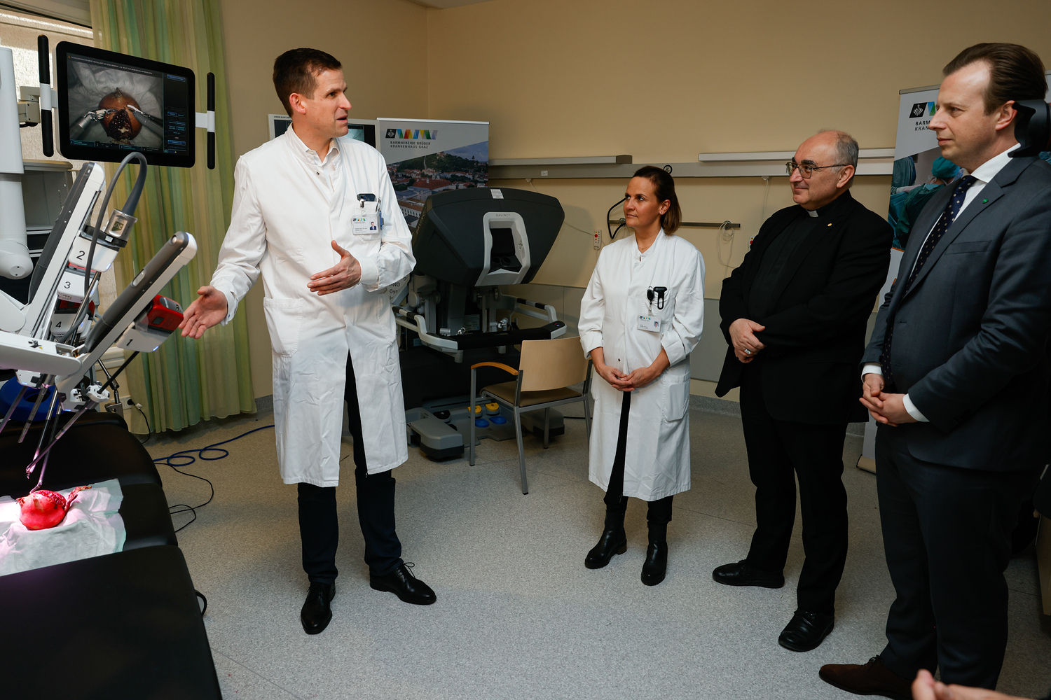 Der Bischof und der Landesrat wurden vom Gesamtleiter der Barmherzigen Brüder, Oliver Szmej, sowie von Pater Prior Antonius Nguyen OH begleitet, der die Bedeutung von Innovation im Gesundheitsbereich betonte: „Das Da Vinci-System ermöglicht minimalinvasive Operationen mit höchster Präzision. Die Vorteile für die Patientinnen und Patienten sind weniger Schmerzen, eine schnellere Genesung und ein reduziertes Risiko für Komplikationen. Dies entspricht dem Motto des Ordens: Gutes tun und es gut tun.“ Gesamtleiter Oliver Szmej betonte abschließend: „Als Lehrkrankenhaus möchten wir junge Ärztinnen und Ärzte auf dem neuesten Stande der Technik ausbilden. Mit der Einführung des Roboter Systems verstärken wir den Fokus auf minimalinvasive, patientenschonende Operationstechniken auch in unserer Ausbildung. Für unsere Operateure, insbesondere der Chirurgie und Gynäkologie, bringt der Roboter die Möglichkeit, moderne Techniken zu erlernen und regelmäßig zum Wohle des Patienten zu verwenden.“