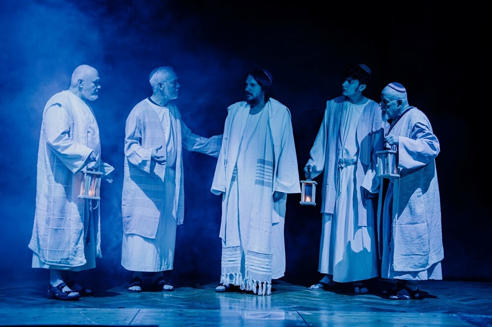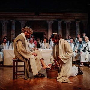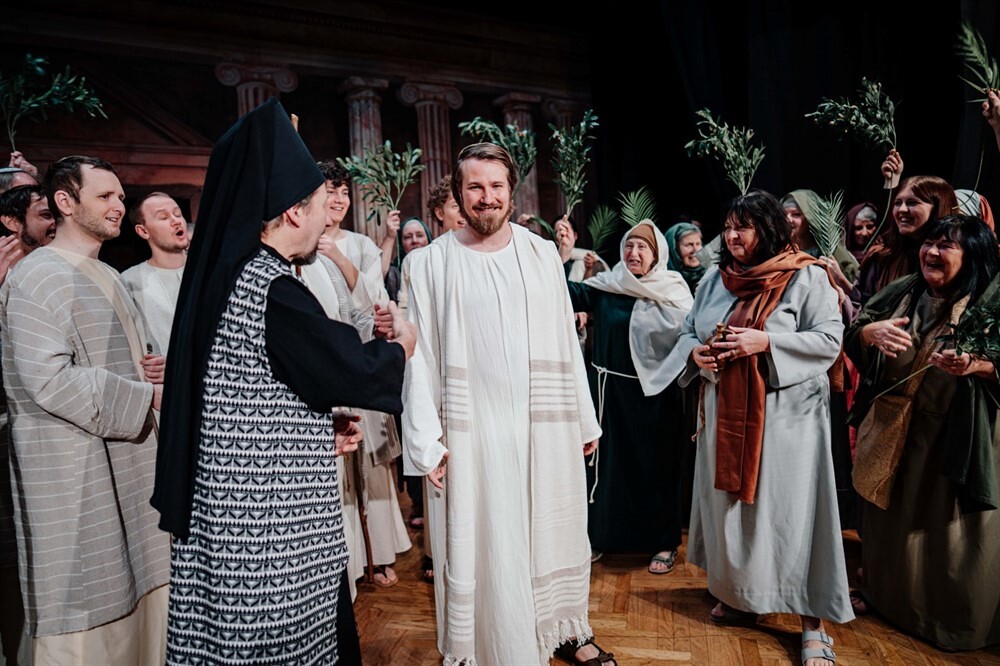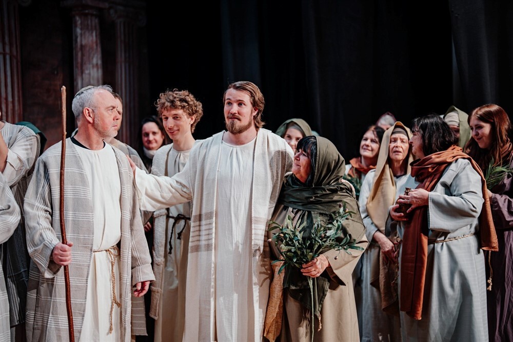 Die Passion beginnt mit der Taufe im Jordan, dem Ruf in die Welt, und führt über den Marktplatz von Jerusalem, wo Hoffnung und Angst dicht nebeneinander liegen. Sie zeigt Jesus als Menschen voller Liebe und Zweifel, als Freund, Prophet und Messias. Als Mächtige zwischen Pflicht, Angst und Verantwortung treten Kaiphas, Pilatus und Herodes auf. Das Volk ruft, fragt, verurteilt – und erkennt vielleicht sich selbst.