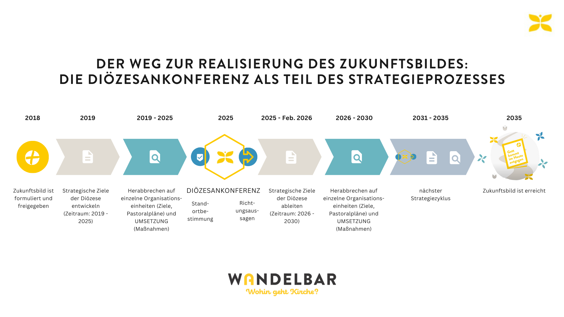 Die Diözesankonferenz ist ein wichtiger Teil des Strategieprozesses der Diözese. Sie prüft den aktuellen Stand und berücksichtigt dabei Entwicklungen in der Gesellschaft und der Kirche. Ziel der Diözesankonferenz ist es, dem Diözesanbischof strategische Richtungsaussagen zu übergeben. Diese sind der Wegweiser für die nächsten fünf Jahre auf dem Weg Richtung Zukunftsbild. Sie ersetzen das Zukunftsbild nicht, sondern konkretisieren es für die nächsten Jahre. Diese Empfehlungen konkretisieren das Zukunftsbild, ersetzen es aber nicht. Es geht nicht darum, ein neues Zukunftsbild zu erstellen oder unrealistische, über die (rechtlichen) Möglichkeiten der Katholischen Kirche Steiermark hinausgehende Ergebnisse zu erzielen.