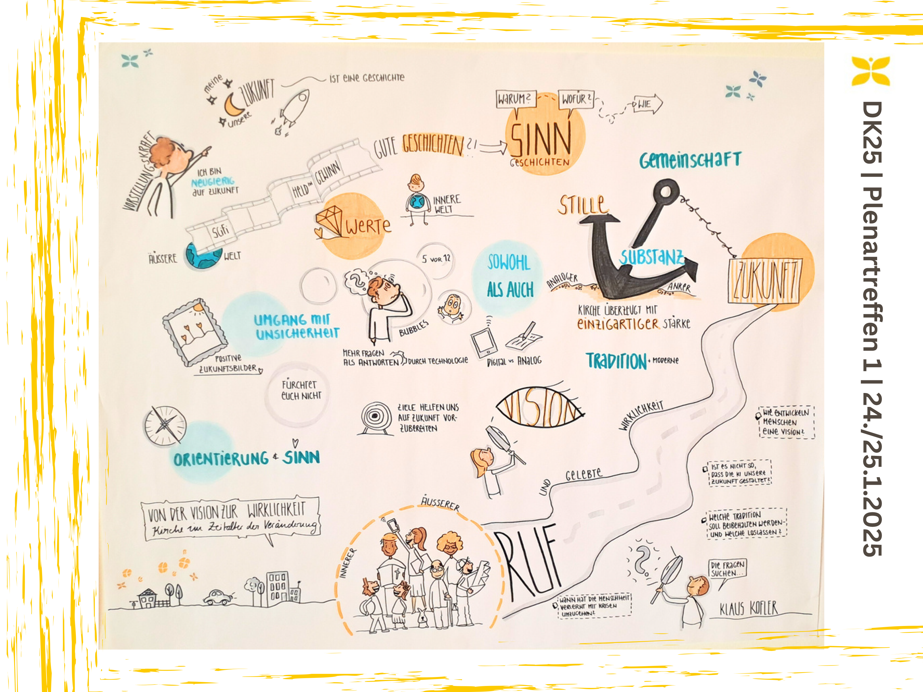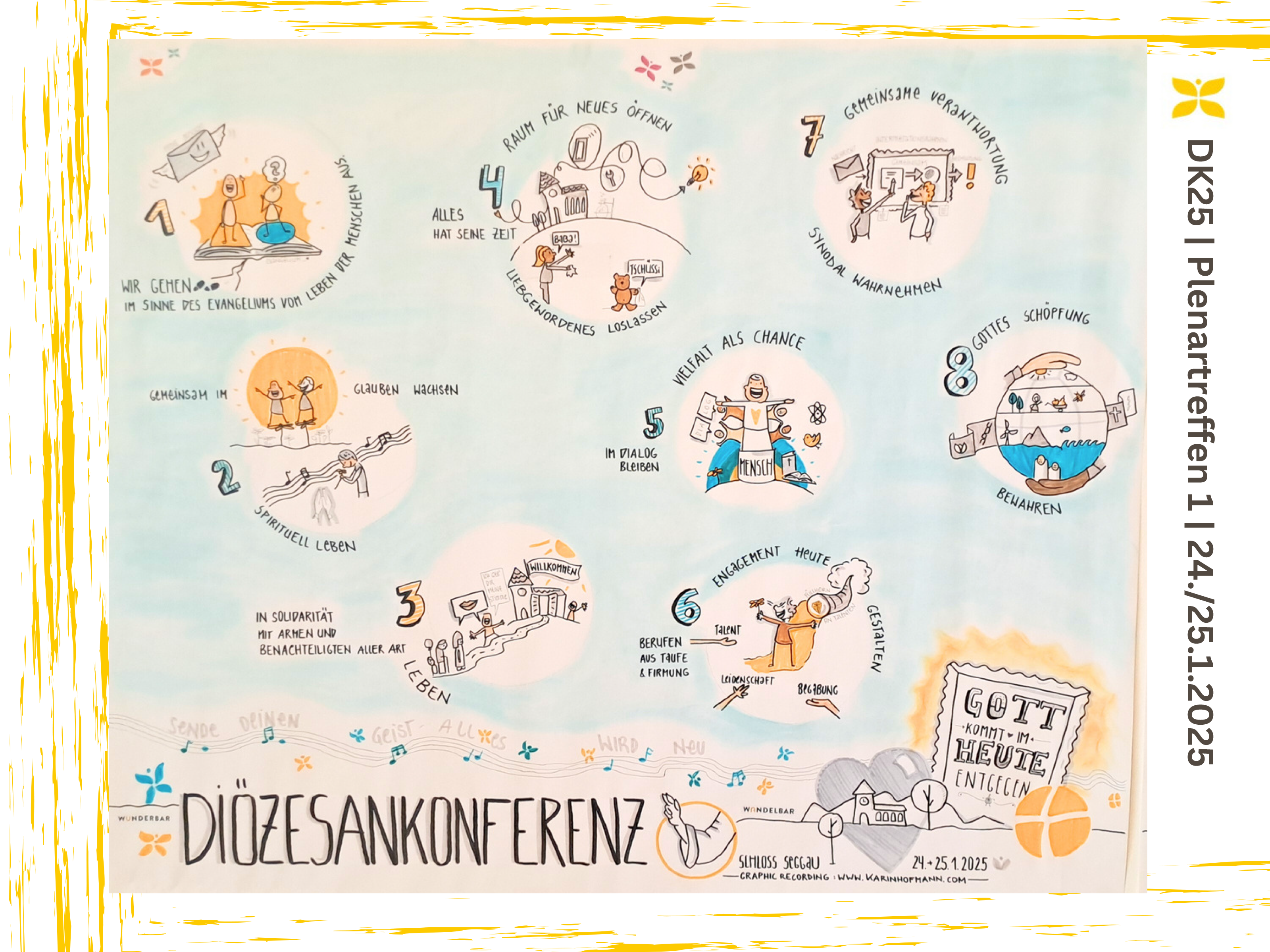 Das 1. Plenartreffen der Diözesankonferenz fand am 24./25. Jänner 2025 auf Schloss Seggau statt. Bei dieser Konferenz entstand dieses Grafic Recording aus der Feder von Karin Hofmann.
