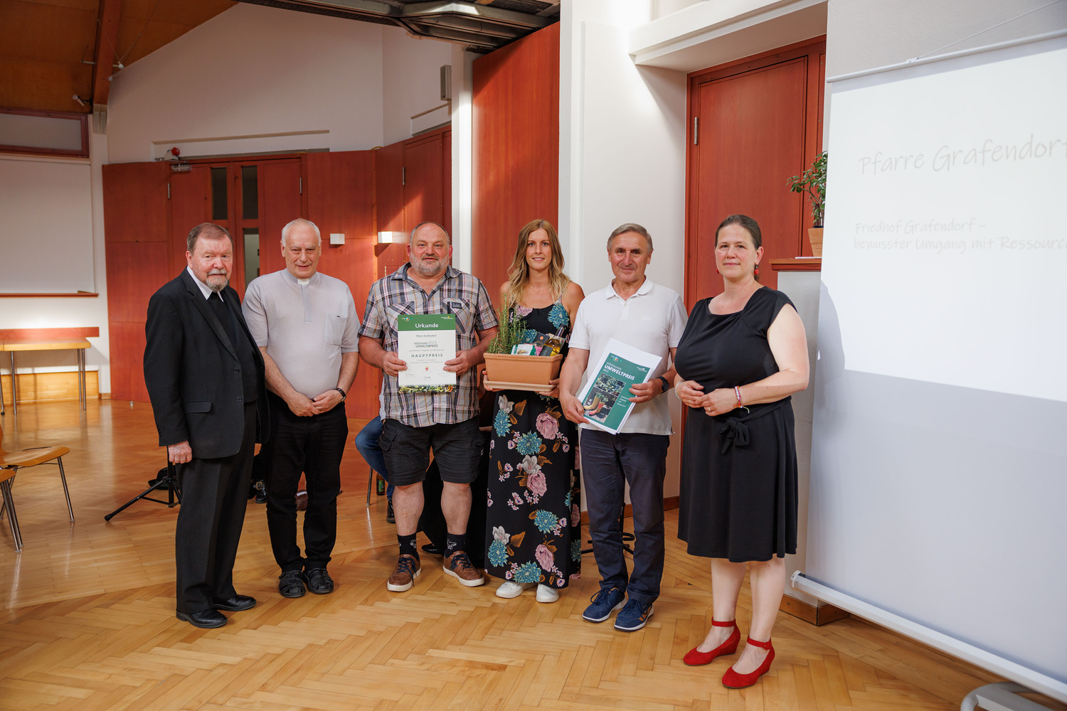 In der Pfarre Grafendorf wurde mit viel Hingabe die Mülltrennung am Friedhof optimiert. Detaillierte Beschilderungen reduzieren Fehlwürfe, Ehrenamtliche kümmern sich um mehrere über den Friedhof verteilte Sammelstellen. Begleitend bemüht sich die Pfarre um Bewusstseinsbildung, um den Ressourcenverbrauch von vornherein zu senken.