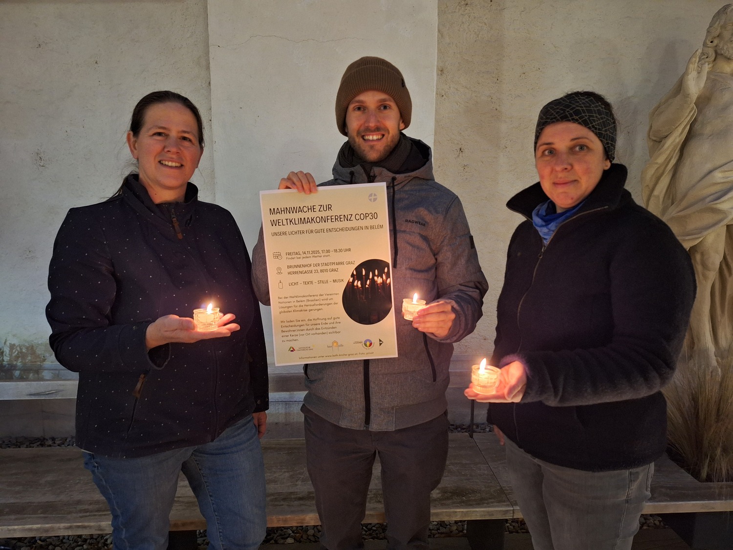 Am Abend nach dem Klimastreik von Fridays for Future in Graz, bei dem auch Vertreter:innen der Religions For Future vertreten waren, fanden sich Umweltaktive und Schöpfungsbewegte sowie Passant:innen im Brunnenhof der Stadtpfarre ein, um in Gedanken an die Weltklimakonferenz COP30 einen Moment inne zu halten.