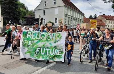 In Graz beteiligten sich Religions for Future beim Demonstrationszug, um gemeinsam mit anderen der Sorge um die zukünftigen Entwicklungen im Klima- und Umweltschutzbereich Ausdruck zu verleihen.