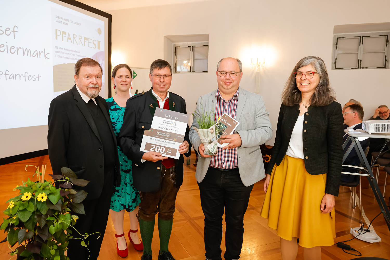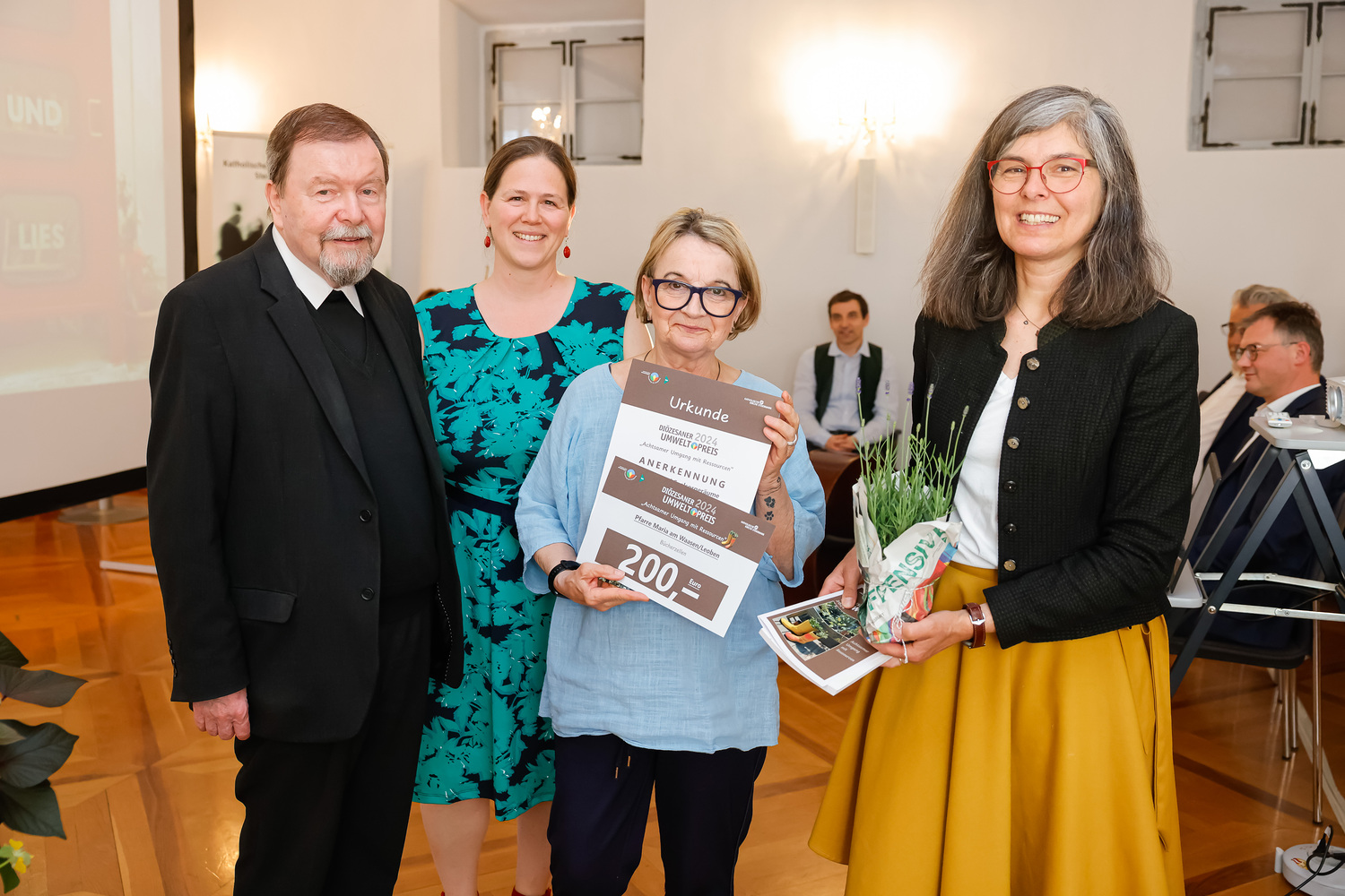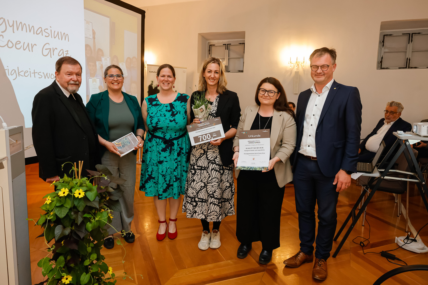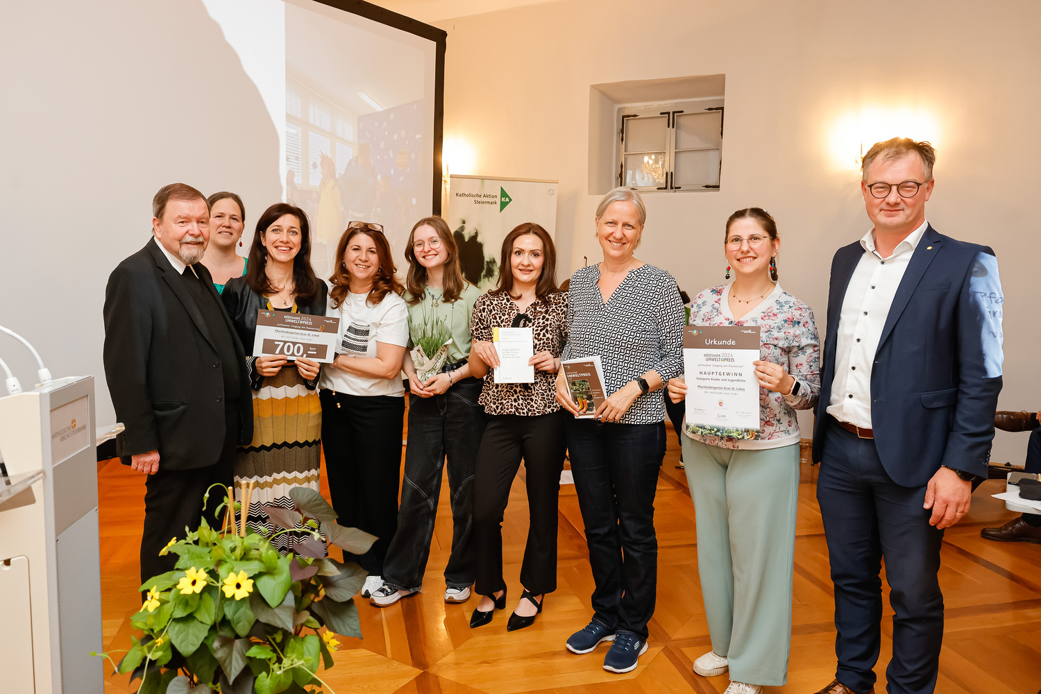 Bereits zum 16. Mal vergab der Arbeitskreis Nachhaltigkeit (AKN) der Katholischen Aktion (KA) den Diözesanen Umweltpreis, der in diesem Jahr unter dem Titel „Achtsamer Umgang mit Ressourcen“ stand. Die Bedeutung der Dankbarkeit gegenüber Gott und der Schöpfung strich Generalvikar Erich Linhardt in seinem Grußwort hervor. Er überreichte die Preise gemeinsam mit der Umweltbeauftragten Eva Heidlmair sowie mit Andreas Gjecaj, Präsident der KA-Steiermark, Martin Halmer, Ökonom der Diözese sowie Anna Kirchengast, Vorstandsmitglied des AKN. Anna Kirchengast stellte in ihrem Grußwort Bezüge zur vor 10 Jahren erschienen Enzyklika Laudato si‘, zur kürzlich durchgeführten Diözesankonferenz und den eingereichten Projekten her – sie alle sind Hoffnungszeichen für eine gute Zukunft.