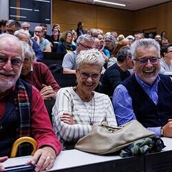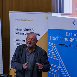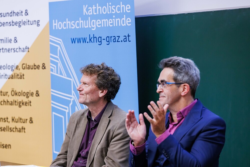 „Demokratie ist schön, sie macht aber viel Arbeit“ – mit diesem Karl-Valentin-Spruch eröffnete Moderatorin Barbara Krenn (ORF) den Abend mit dem deutschen Soziologen Hartmut Rosa und dem Grazer Religionswissenschaftler Franz Winter im rappelvollen Hörsaal am Uni-Campus. Die drei Hauptveranstalter stimmten auf den prominenten Gast ein: Mit „hörenden Herzen“ haben sich kirchliche und universitäre Player, so Kathrin Karloff, Leiterin des Bildungsforums Mariatrost, „erstmals oder neu zusammengefunden“, um den „Resonanzverhältnissen“ zwischen – bedrängter – Demokratie und Religion auf den Grund zu gehen und gemeinsam den Bildungsherbst einzuläuten. Alois Kölbl, als Hochschulseelsorger das akademische Jahr der Katholischen Hochschulgemeinde eröffnend, wies auf die Wichtigkeit unterschiedlicher gesellschaftlicher Resonanzorte hin. Martin Hochegger von der “1934“-Reihe „Zukunft braucht Erinnerung“ betonte die demokratische Arbeit an offenen Diskursräumen, in denen man sich mit Blick aufs Morgen auch kirchenhistorischen Schattenseiten stellt – also ganz im Sinne von Hartmut Rosa, der „sich nicht scheut“, mit unterschiedlichsten Menschen in Kontakt zu treten, um seine Gedanken mit Verve und Selbstironie zu vermitteln.