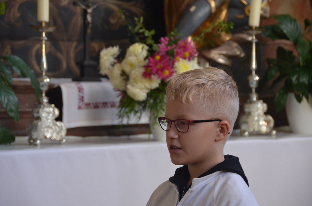 Bei der Allerheiligenlitanei wurden die Heiligen unserer Filialkirche angerufen, wobei die Ministranten auf ihr Bild dabei zeigten.