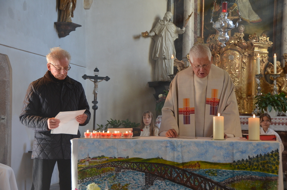 Nach der Predigt wurden die Heiligen, die in der Peggauer Kirche dargestellt sind, angerufen, wobei die Ministranten auf die Heiligenfiguren zeigten.