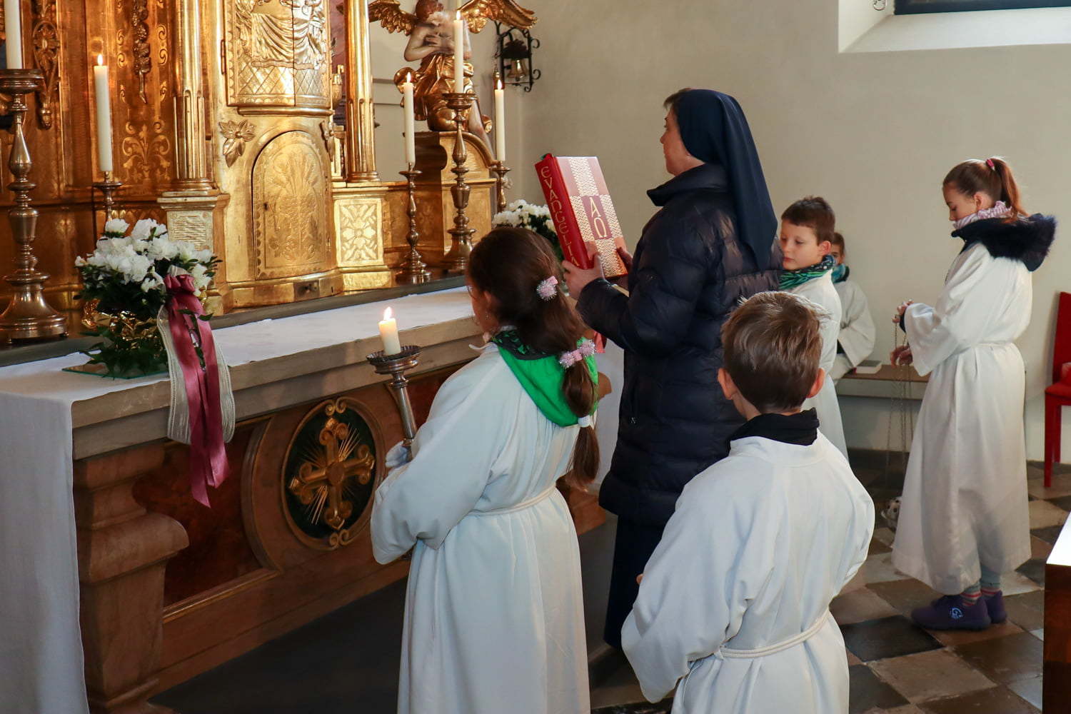 In der Wortgottesfeier ist mehr Raum für neue Elemente. So tanzte Barbara Koren mit einigen Frauen und Kindern den Tanz „Samen der Liebe“. Gebet ist nicht nur reden, singen, still sein … sondern auch mit Leib und Seele, mit dem ganzen Körper meinen Glauben zum Ausdruck zu bringen. Vor dem Segen zeigten die Kinder mit einer symbolischen Handlung – das Aufblühen „einer Blüte“ mit Seidentüchern – was es bedeutet, füreinander zum Segen zu werden.