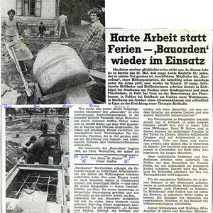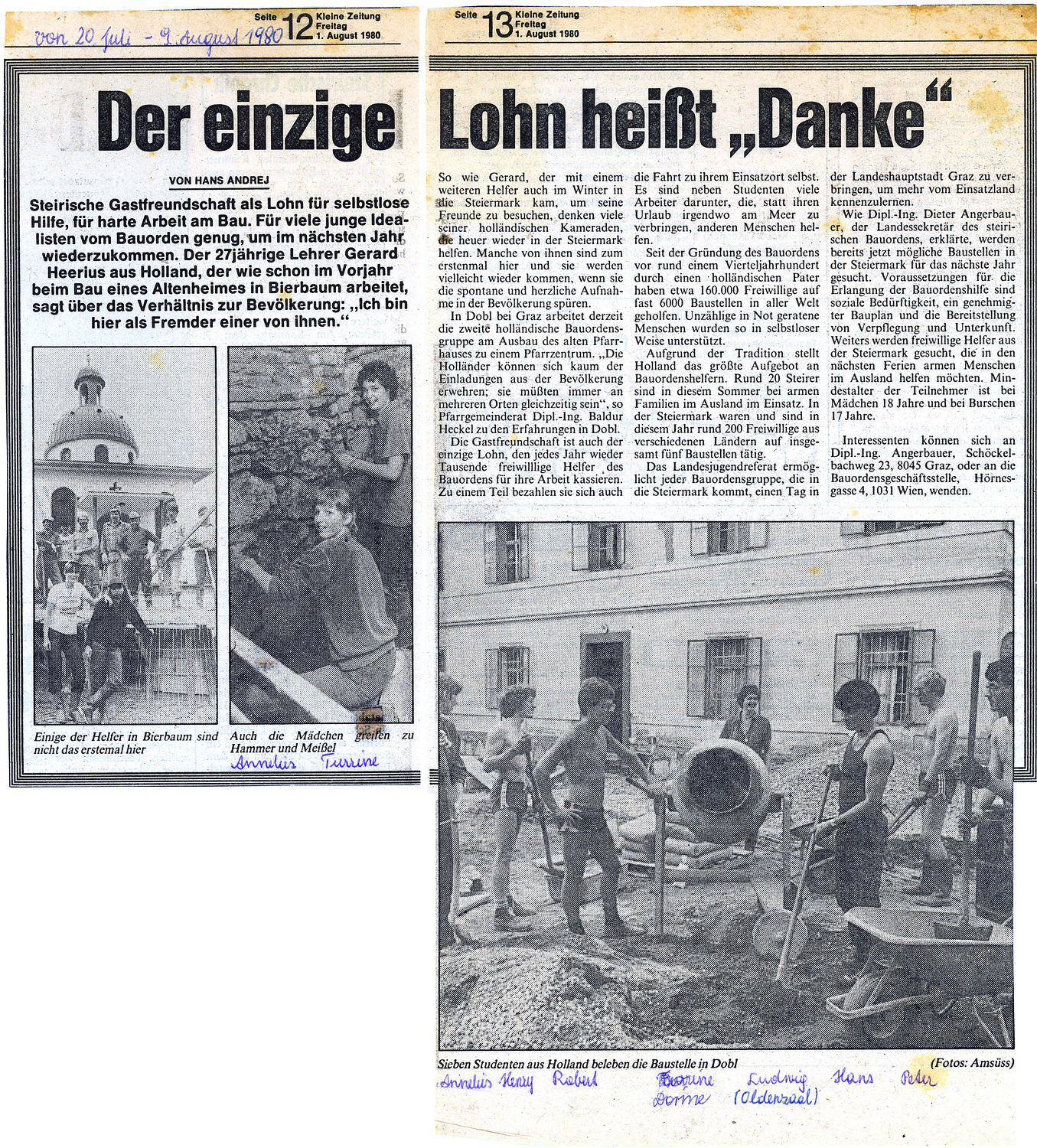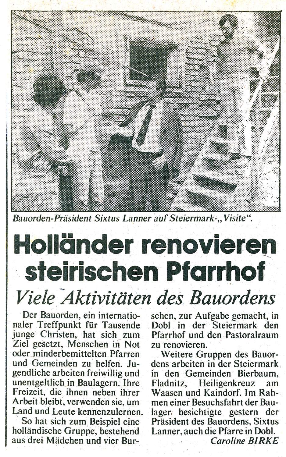Erste Ausbaustufe bis November. Wie gemeldet, wird im Pfarrhof Dobl ein Gemeindezentrum eingerichtet. Das Ordinariat beauftragte die Architekten Angerbauer — Stummer mit der Planung, Ausschreibung und Bauüberwachung, da zu wenig eigene Kräfte vorhanden waren. In Zusammenarbeit mit dem Pfarrgemeinderat und dessen Bauausschuss entstand ein Konzept, das vom Bauamt genehmigt wurde. Eine Million Schilling zuzüglich der Weingartenstiftung von 112.000 S stehen für 1981 zur Verfügung. Mit diesem Geld werden folgende Leistungen erbracht: Zentralheizung, neue Fenster, neue Elektroinstallation, Baumeisterarbeiten, neue Fußböden, Malerarbeiten, WC-Anlagen usw. Wertvolle Arbeit leistete auch heuer wieder der holländische Bauorden. Wenn alle Arbeiten planmäßig abgeschlossen werden, so stehen ab November zwei Jugendräume im Keller, ein Saal für ca. 70 Personen, ein Besprechungsraum, eine Küche sowie die neue Pfarrkanzlei für die Pfarrarbeit zur Verfügung. Die Gestaltung des oberen Stockwerkes und die Renovierung der Außenfassade müssen auf einen späteren Zeitraum verschoben werden. Ziagl & Senda, September 1981, S. 6 |