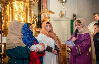 Die Kinder spielten die bekannte Bibelstelle aus Lukas 2,22–40, wo Maria und Josef mit dem kleinen Jesus in den Tempel kommen, das Kind Gott weihen.