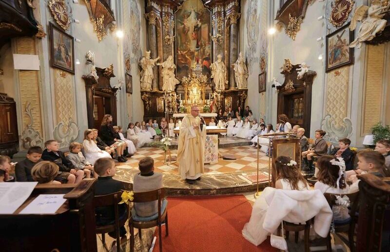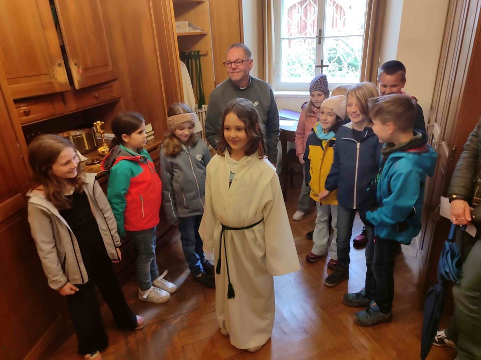 Im Rahmen der Vorbereitung wurde neben den drei gemeinsam gestalteten Familiengottesdiensten zudem eine Kirchenführung mit vier Stationen angeboten, bei der die Kinder ihre Pfarrkirche ganz neu entdecken durften. Der Altarraum, die Sakristei, der Klostergarten und die Spiele im Pfarrsaal wurden erkundet – verbunden mit vielen spannenden Informationen über Symbole und liturgische Gegenstände.