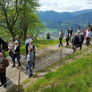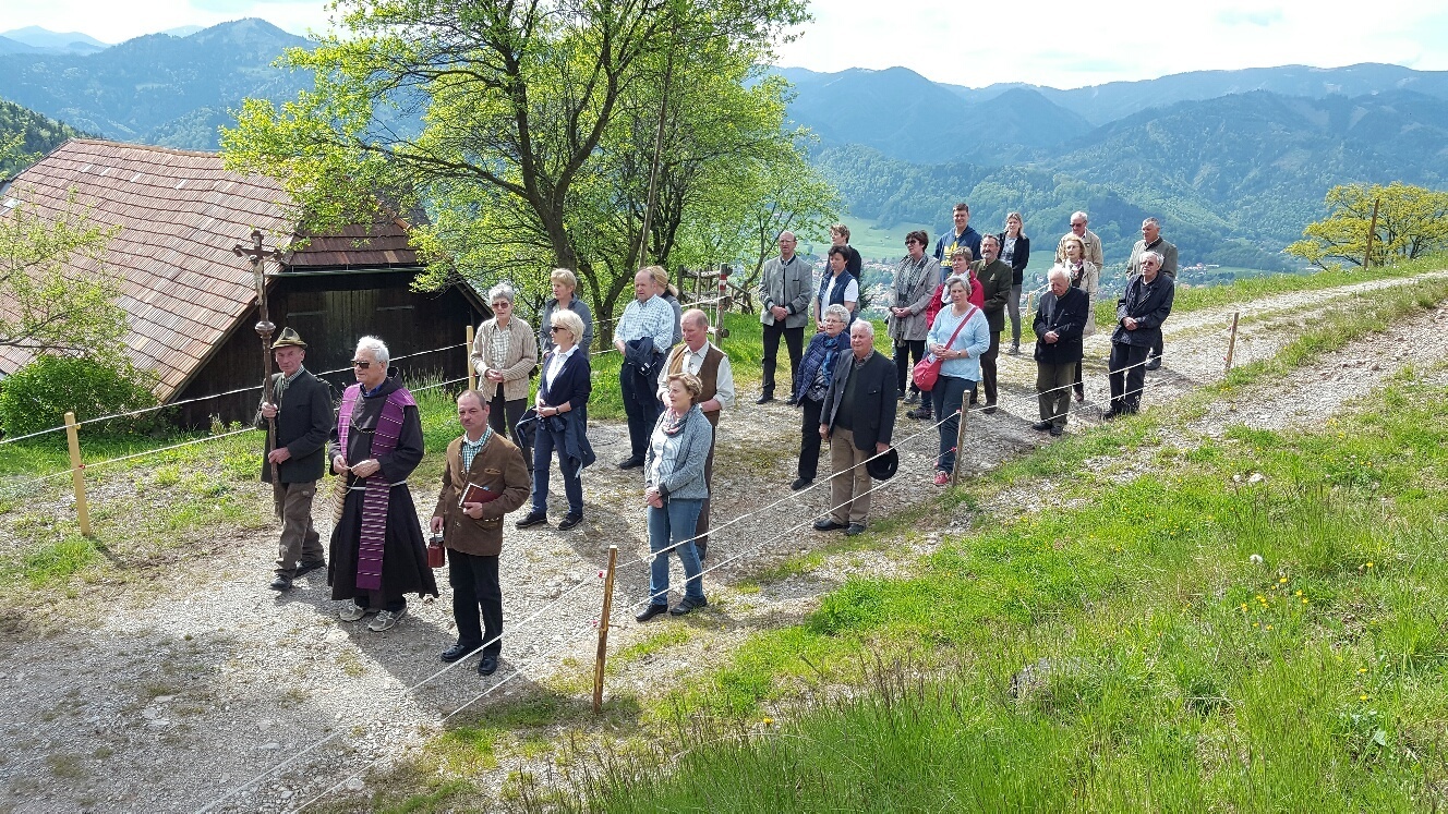 Bei schönem Wetter und toller Aussicht auf Frohnleiten wanderten zahlreiche Personen mit. Pater Simon gestaltete diese Feldersegnung mit Unterstützung der Dirnbergbauern.