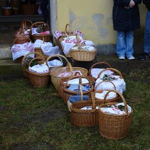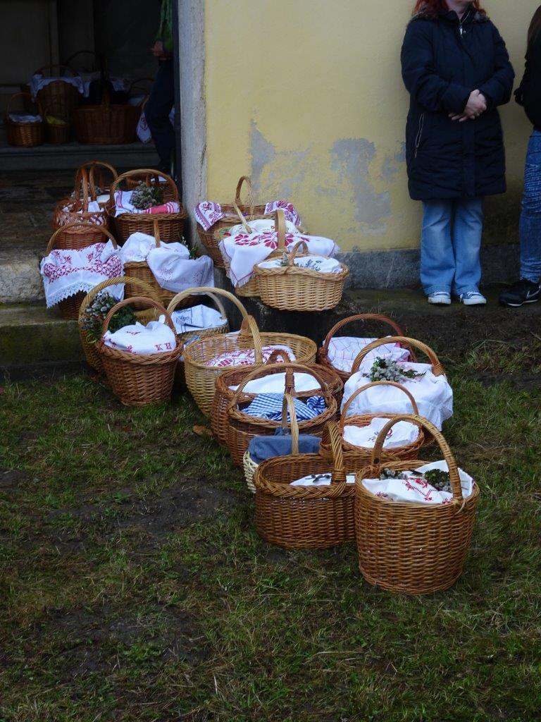 Gesegnet werden - wie der 1. Osterspeisensensegnung der Pfarre um 8.30 Uhr bei der Grenz-Kapelle in Badl, bzw. bei einer der weiteren bei der Barbarakapelle in Schrems - Schinken, Würste, geselchte Zungen, gefärbte Ostereier, Brot, Kren und Salz in einen Korb mit einer schön gestickten Weihkorbdecke.