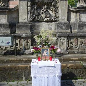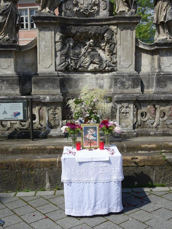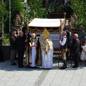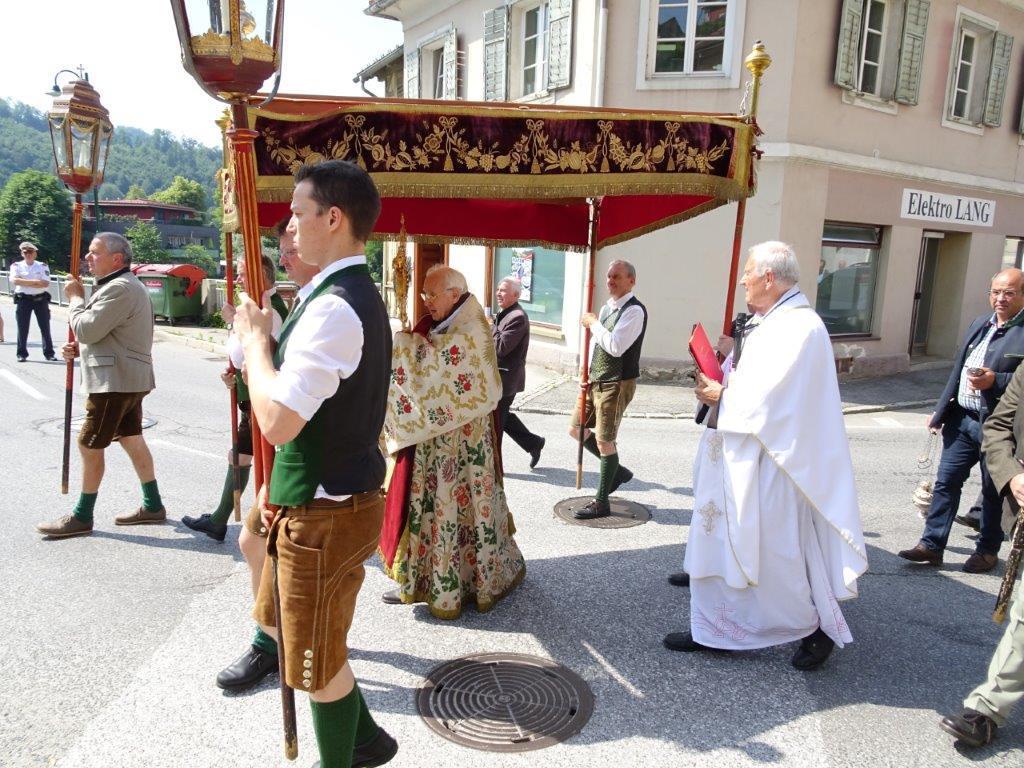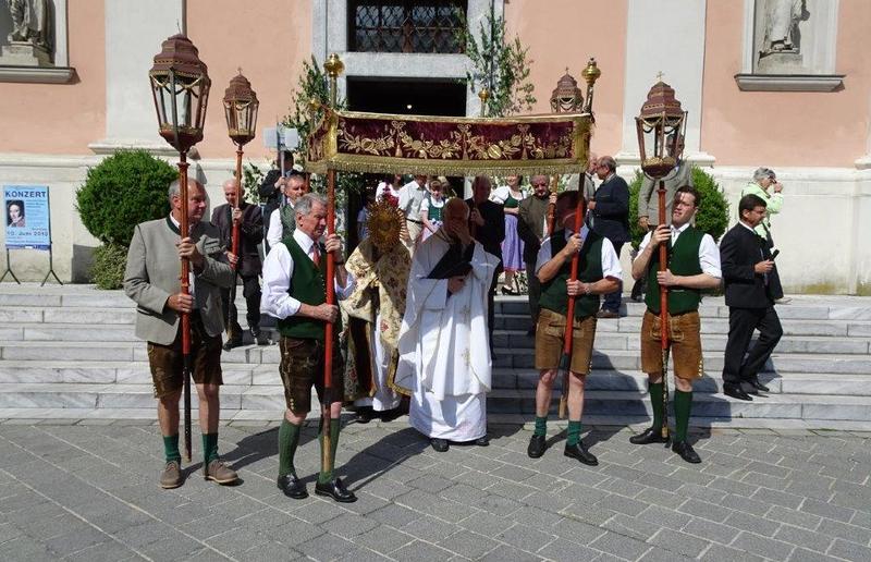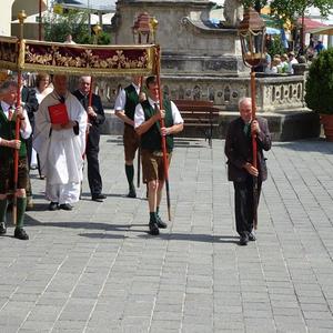 Am Beginn des Fronleichnamsfestes, dem "Hochfest des Leibes und Blutes Christi" stand ein festlicher Gottesdienst in der Pfarrkirche, zelebriert von Franziskanerpater Bernardin Schröder und  Pater Simon. Hernach folgte die feierliche Prozession mit einer Monstranz (Gefäß, in dem eine Hostie für den Leib Christi aufbewahrt ist) unter einem Baldachin zu den Stationen mit den liebevoll geschmückten 4 Altären im Römerpark, Vormarkt (Missionskreuz), am Taboraufgang und bei der Mariensäule am Hauptplatz, wo jeweils die Evangelien gelesen und der eucharistische Segen erteilt wurde.