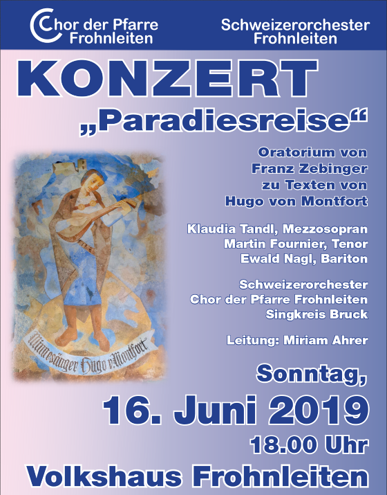 Für ein ganz besonderes Konzert haben sich der Chor der Pfarre Frohnleiten, der Singkreis Bruck und das Schweizerorchester Frohnleiten unter der Leitung von Miriam Ahrer zusammengeschlossen: Am Programm steht das Oratorium „Paradiesreise“ des steirischen Komponisten Franz Zebinger (geboren 1946). Dem groß besetzten Werk liegen Texte von Hugo von Montfort (1357-1423) zu Grunde, der als einer der letzten Vertreter des deutschen Minnesangs gilt.