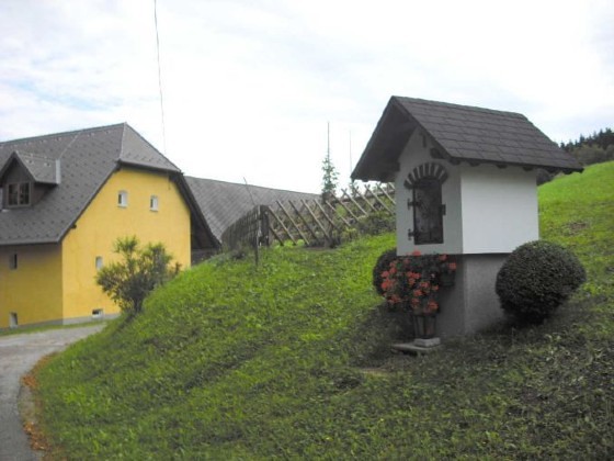 Eine Besonderheit ist das an der Giebelseite angebrachte Holzkreuz, das der verunglückte Peter anlässlich seiner Erstkommunion erhalten hatte.