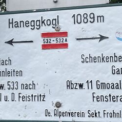 Der Haneggkogel ist ein beliebtes Ausflugsziel für viele Wanderer. Dort steht in 1.089 m Seehöhe ein sieben Meter hohes Gipfelkreuz aus Holz. Dieses wurde 1954 aus Anlass des „Marianisches Jahres“ (Vorbereitung auf das Jubiläum der 100. Wiederkehr der Verkündigung des Dogmas von der Unbefleckten Empfängnis – vom Papst ausgerufen) von den Landjugendmitgliedern aus Waldstein, Deutschfeistritz und Schenkenberg aufgestellt. Den Erzählungen nach, war bei den sonntäglichen Zusammenkünften im Hause des Brandstätter-Bauern diese Idee herangereift. Alle Materialien für dieses Zeichen des Glaubens wurden damals händisch oder mit den Pferden auf den Gipfel gebracht, wo es als Symbol in alle vier Himmelsrichtungen blickt.