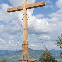 Das alte Gipfelkreuz am Haneggkogel, das ursprünglich 1954 von der Katholischen Jugend Waldstein errichtet wurde, war in die Jahre gekommen und musste daher erneuert werden. Und so wurde das alte Kreuz demontiert und unter tatkräftiger Mithilfe vieler Grundstücksnachbarn und Freunde der Familie Jantscher vulgo Hanegg-Gruber bei herrlichem Wetter im Sommer 2024 durch ein neues ersetzt. Der Lärchenbaum, aus dem das neue Kreuz gefertigt wurde, stammt nur etwa 100 Meter entfernt vom Gipfel des Haneggkogels.