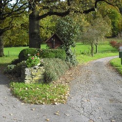 Das Wegkreuz ist auf einem stabilen Betonsockel befestigt. Davor ist ein kugelförmiger Eibe-Wacholder-Strauch gepflanzt, der von Bediensteten des Forstgartens gepflegt wird. Seitlich steht noch ein wolliger Schneeball, ein kräftiger, sommergrüner und weißblühender Strauch.