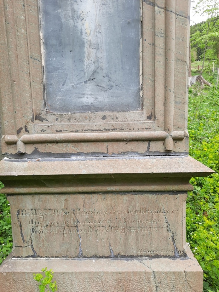 An der Vorderseite ist noch ein sehr vergilbtes Bild vorhanden, das vermutlich den Heiligen Josef mit dem Jesuskind auf dem Arm darstellt. Eine Eisenstange an der Rückseite stützt das Kreuz.