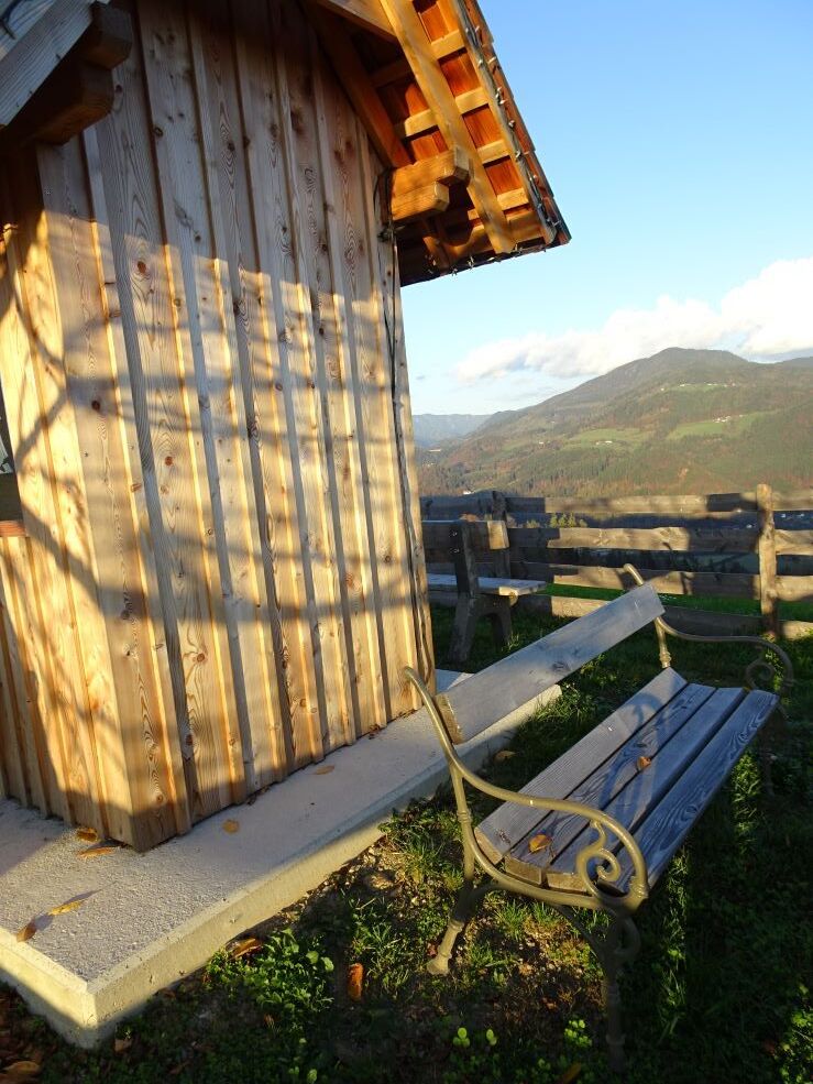 Das Bauwerk ist mit einem Original-Schindeldach gedeckt, angefertigt von einem exzellenten Schindelmacher.Im Außenbereich sind noch drei Sitzbänke aufgestellt, um das umfassende Panorama der heimische Bergwelt genießen zu können. Die Kapelle ist noch mit einem Holzzaun umgeben.