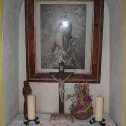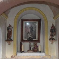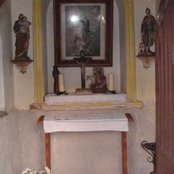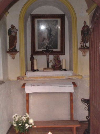 Die Kapelle, die sich harmonisch in die Landschaft fügt, wurde zwischen dem Wohnhaus und zwei Bäumen platziert und aus Stein im neoklassizistischen Stil errichtet. Über eine Rundbogentür aus Holz gelangt man in das Innere, in dem zentral in einer großen Mauernische eine Darstellung der Himmelfahrt Mariens zu sehen ist. Mariä Himmelfahrt ist also nicht nur unsere Pfarrkirche geweiht, sondern auch eine kleine Kapelle auf dem Pfannberg! Vor diesem Bild stehen ein Kruzifix auf einem Holzsockel, eine Marienstatue und ein schönes Erntedankgesteck. In den beiden Ecken der Stirnwand sind zwei Statuen angebracht, die vermutlich von Grödentaler Holzschnitzern gefertigt wurden und die den heiligen Josef mit dem Jesuskind und den heiligen Florian, den Patron gegen Feuersgefahr, darstellen. Ein hölzerner Betstuhl lädt ein zur inneren Einkehr und Besinnung in dieser Hauskapelle.