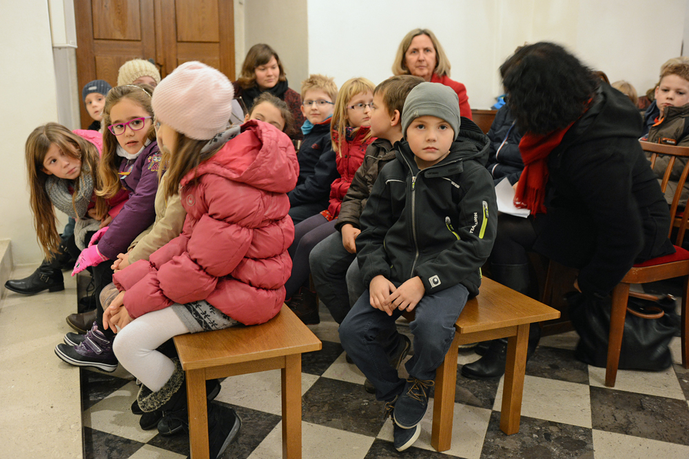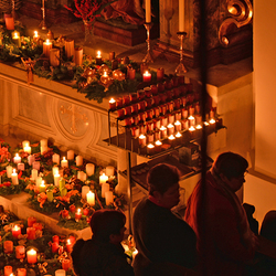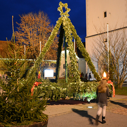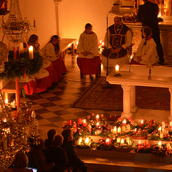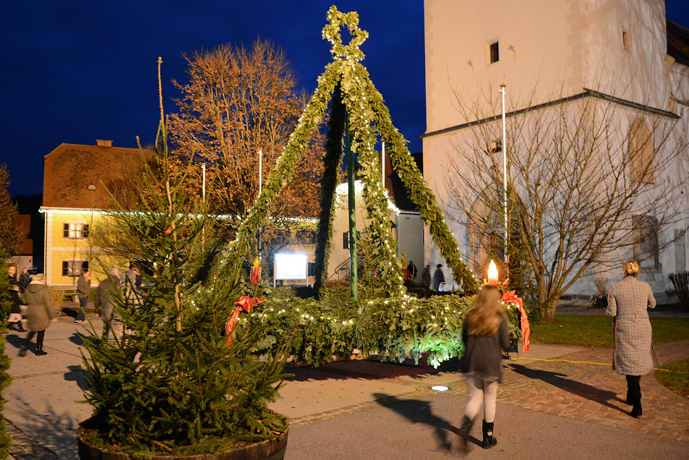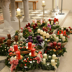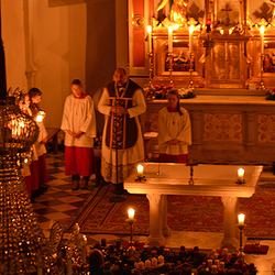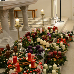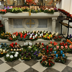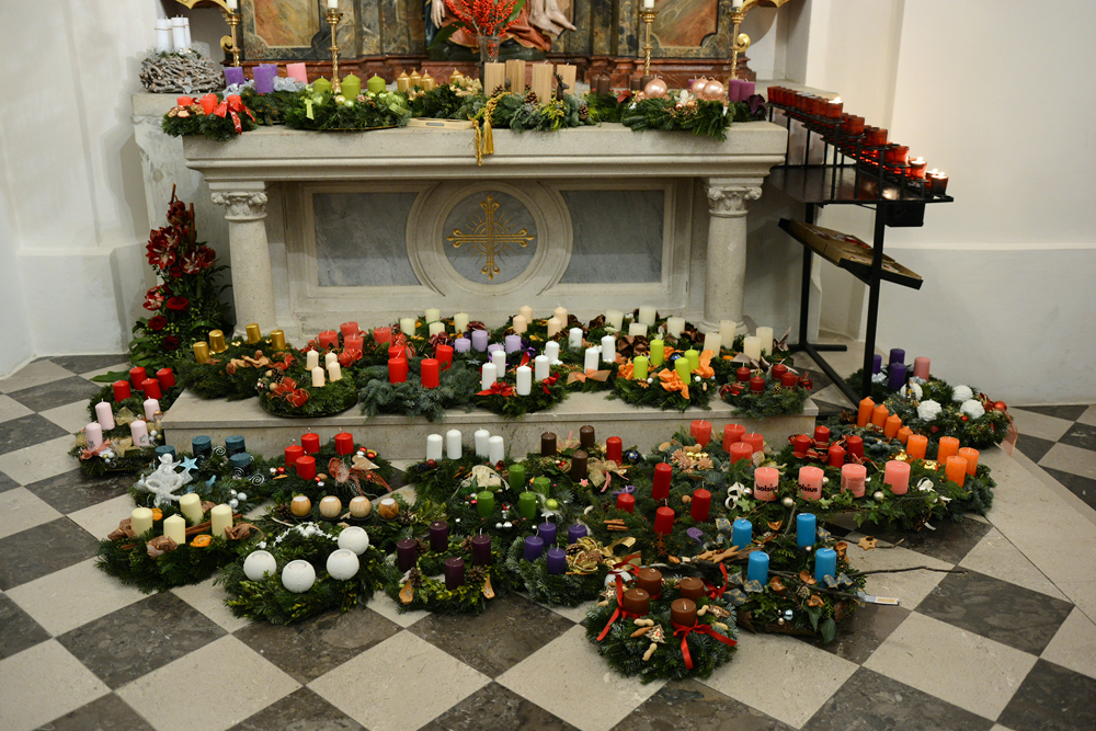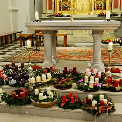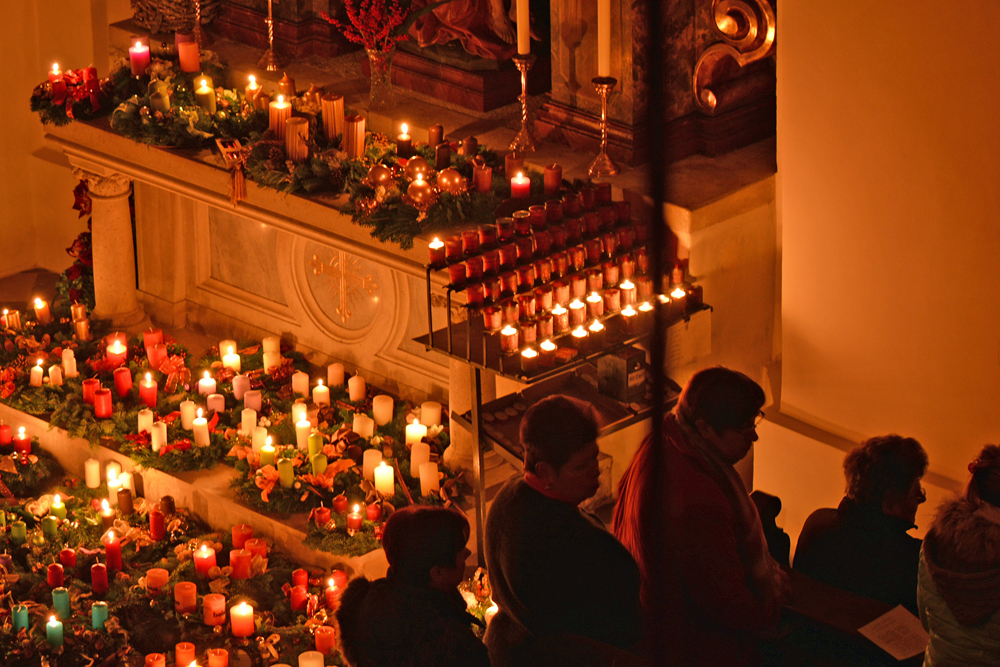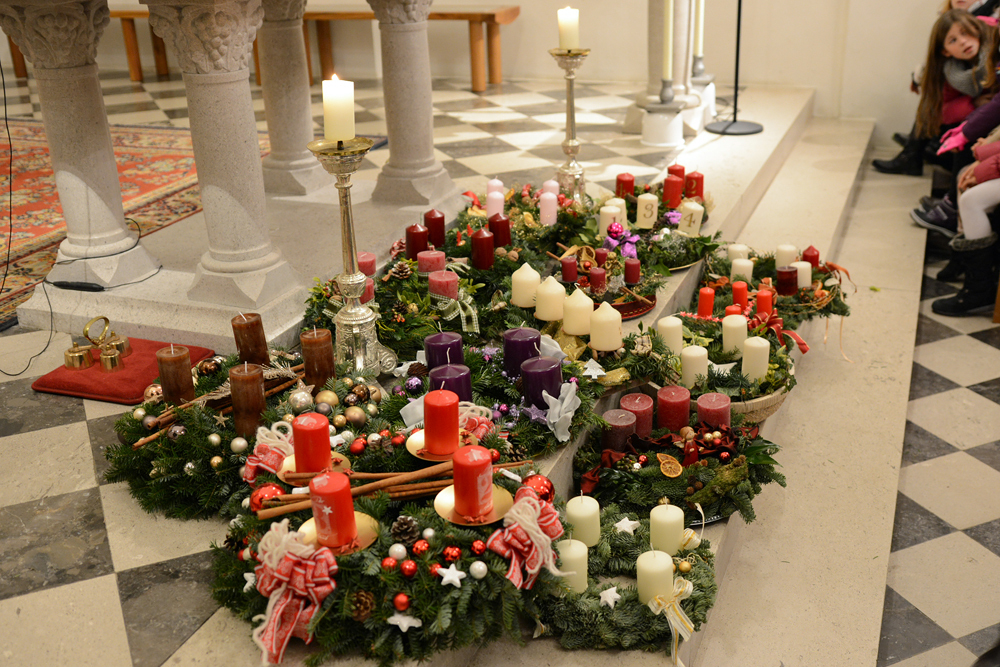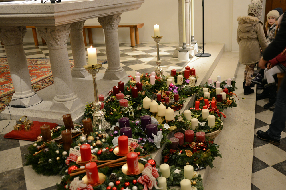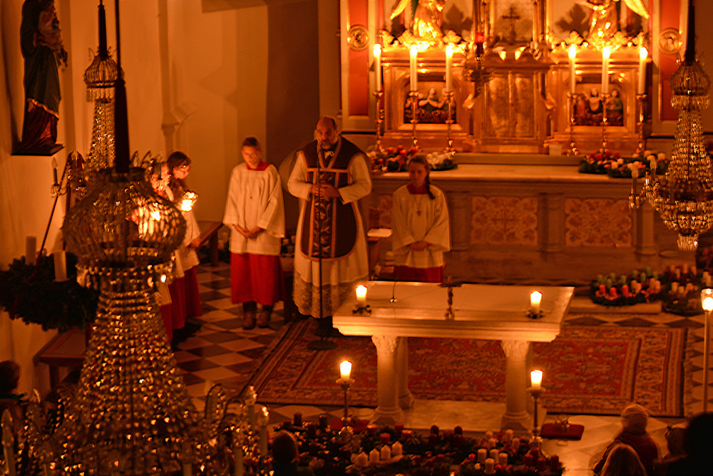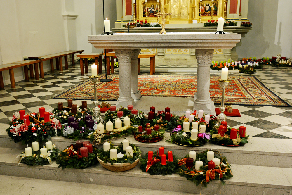 Den Auftakt zum Advent bildet auch in unserer Pfarrkirche die Adventkranzweihe. Eine große Schar von Gläubigen findet sich in der bewusst unbeleuchtet gehaltenen Pfarrkirche zur Messfeier ein. Mystisch fast die Atmosphäre des spärlich beleuchteten Altarraumes während des Wortgottesdienstes, bis dann endlich bei der Weihe der Adventkränze die ersten Kerzen auf den Adventkränzen entzündet werden, die das Kirchenschiff in flackerndes Licht tauchen. (Robert Glück)