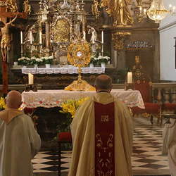 Am Donnerstag, den 03. Juni 2021, feierten wir um 09:00 Uhr zeitgleich mit elf Pfarren der Katholischen Stadtkirche Graz das Hochfest des Leibes und Blutes Christi - Fronleichnam. Hauptzelebrant war Pfarrer P. Petru Farcaș OFMConv., Konzelebrant war Konventspriester P. Clemens Breineder OFMConv. Am Ende der Heiligen Messe wurde das Allerheiligste zur Anbetung ausgesetzt und gemeinsam eine Andacht gehalten; es folgte der Abschluss durch sakramentalen Segen. Musikalisch gestaltet wurde die Festmesse von Mitgliedern der Kantorei Mariahilf und der Franziskuskantorei unter der Leitung von Organist Prof. Herbert Bolterauer.