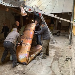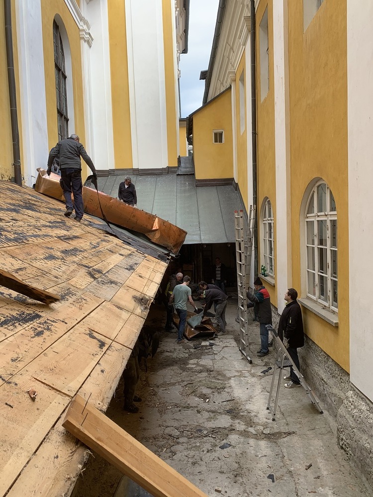 Für die Dach- und Fassadenrestaurierung mußte am Freitag, 12.03.2021 die Holzhütte im Innenhof ausgeräumt und abgetragen werden.