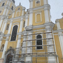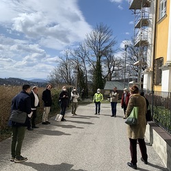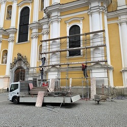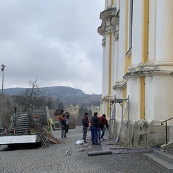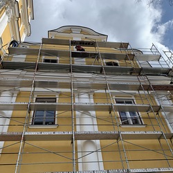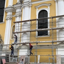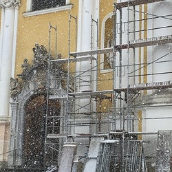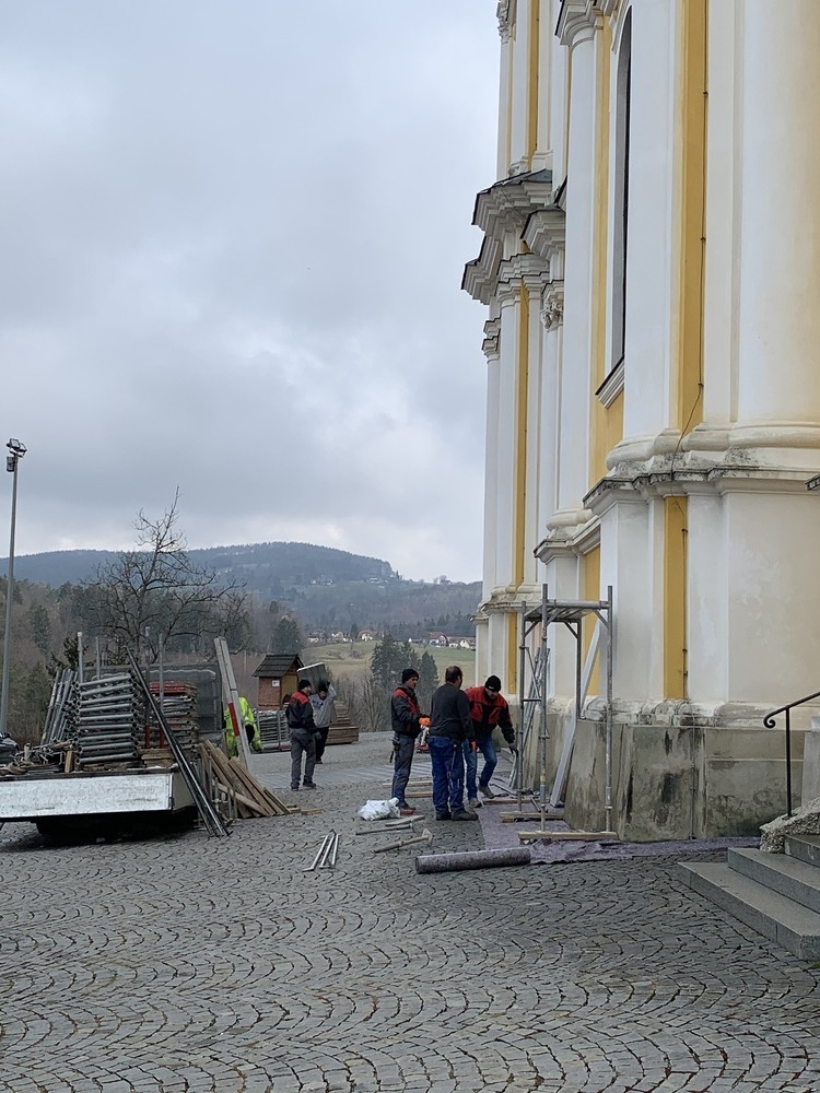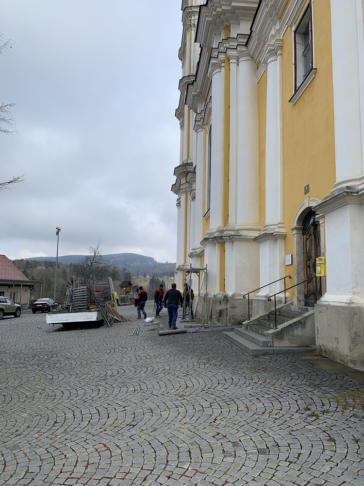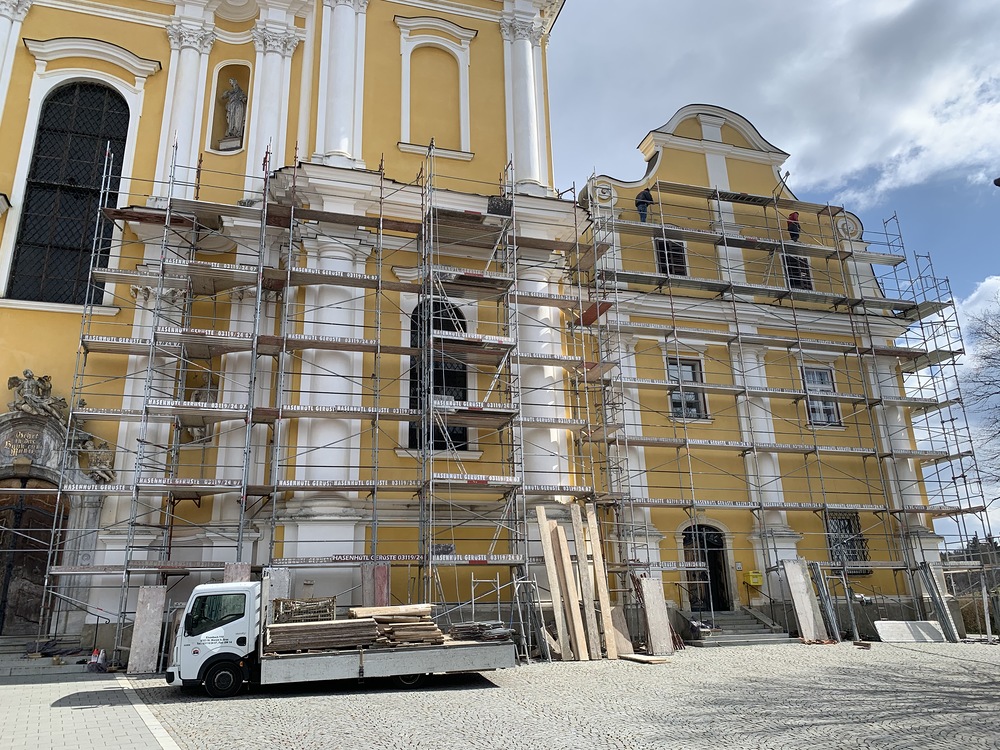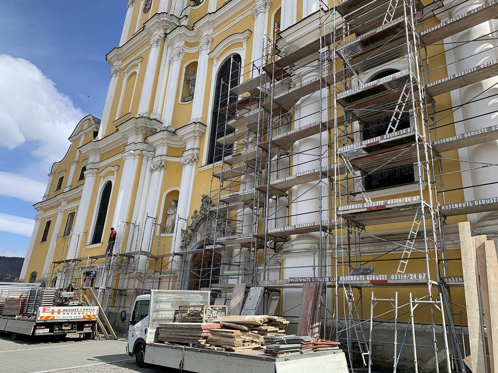 Am Samstag, 20.03.2021 wurde mit dem Einrüsten der Fassade begonnen. Neben den Bauarbeiten finden immer wieder auch Baubesprechungen mit den ausführenden Firmen und dem Bundesdenkmalamt statt.