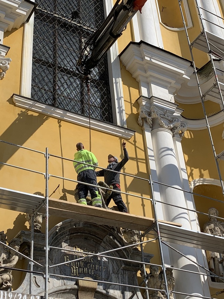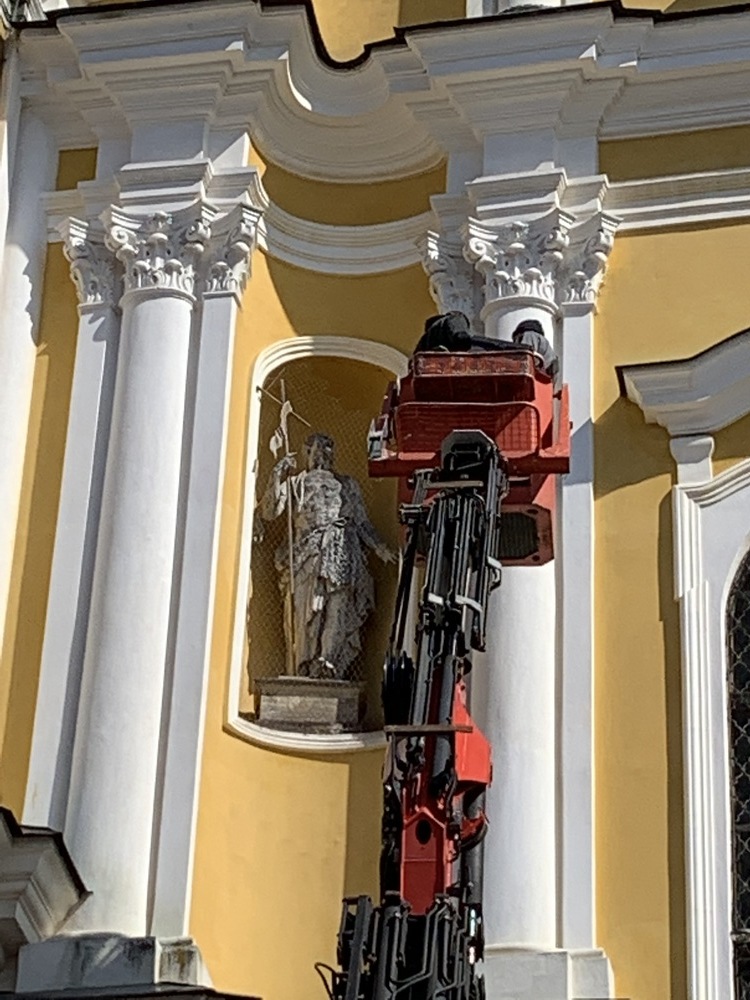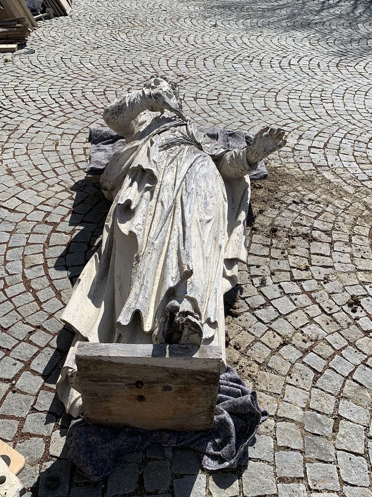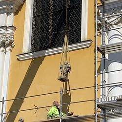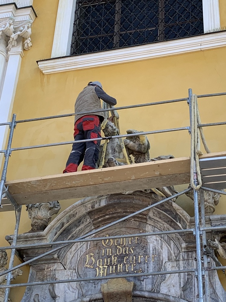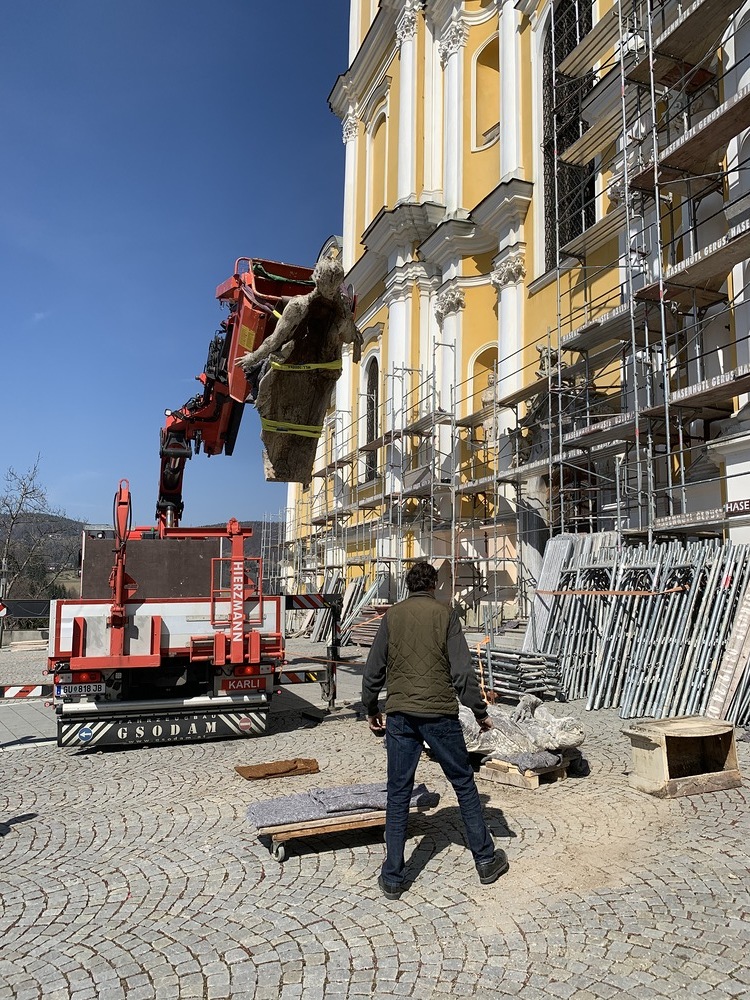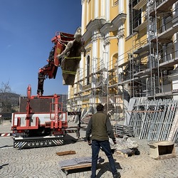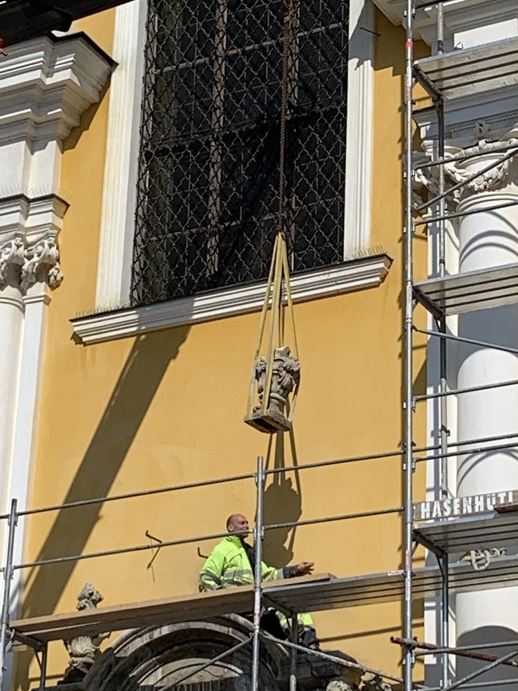 Am Donnerstag, 25.03.2021 wurden die Holzfiguren an der Fassade und die Steinfiguren über dem Hauptportal für Restaurierungsarbeiten abgetragen.