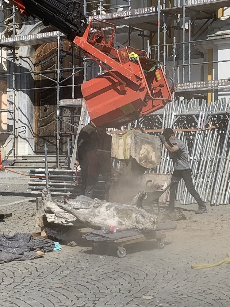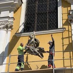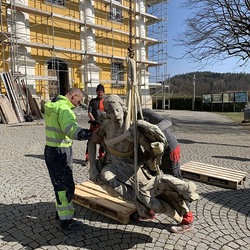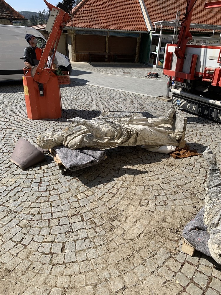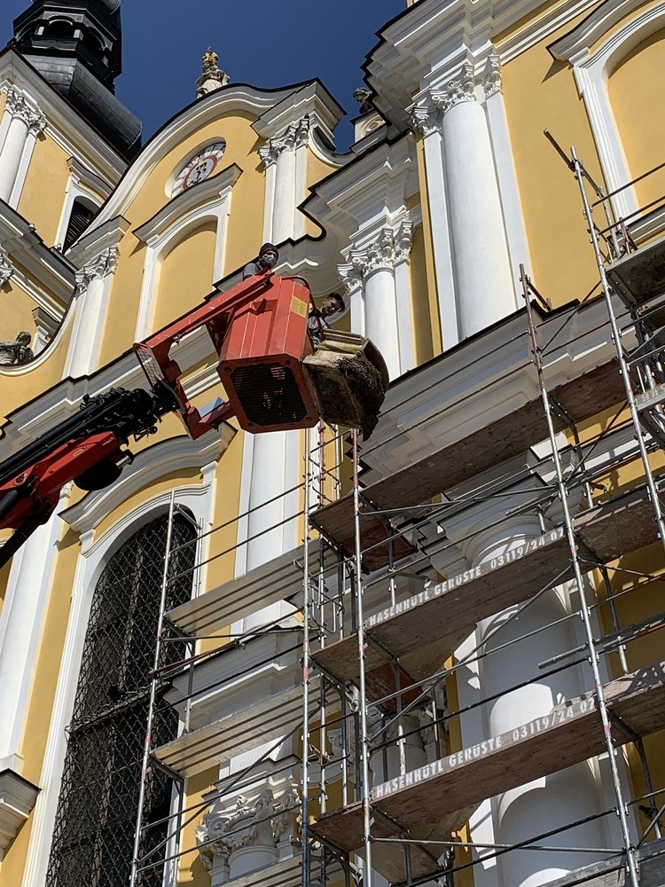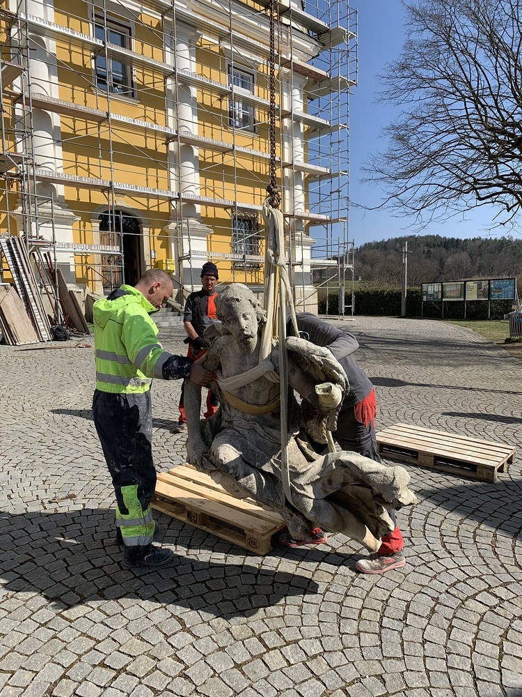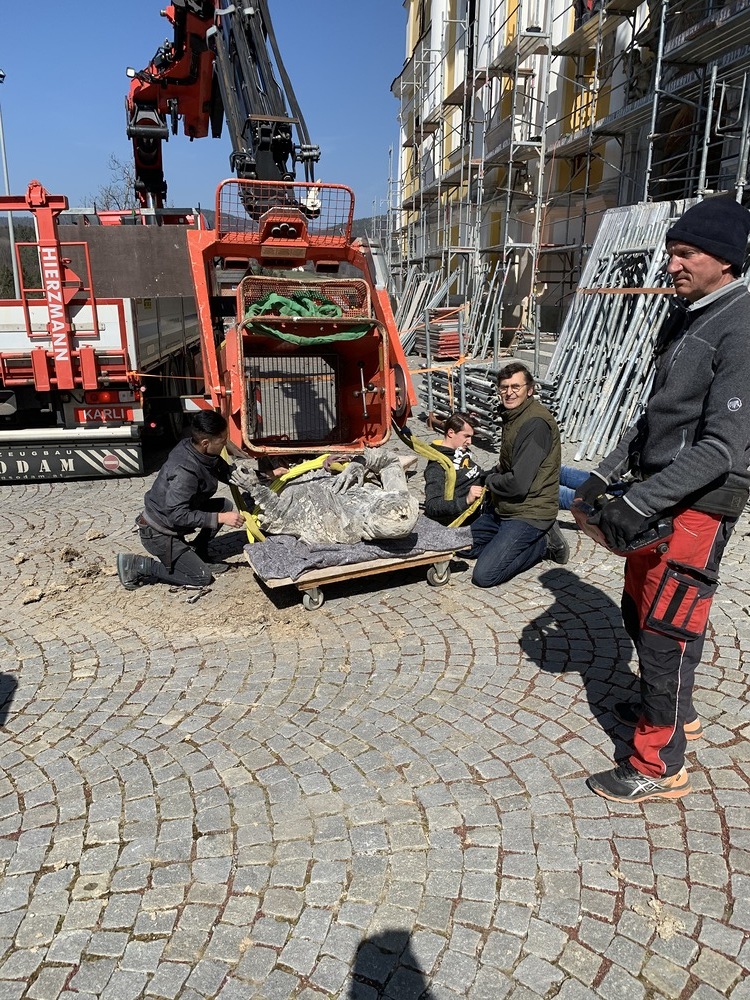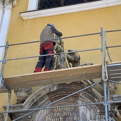Am Donnerstag, 25.03.2021 wurden die Holzfiguren an der Fassade und die Steinfiguren über dem Hauptportal für Restaurierungsarbeiten abgetragen.