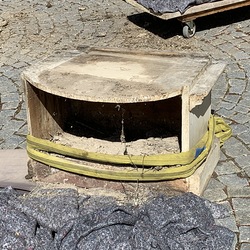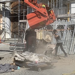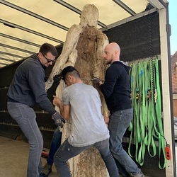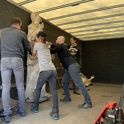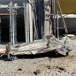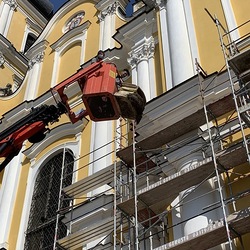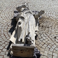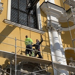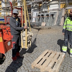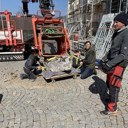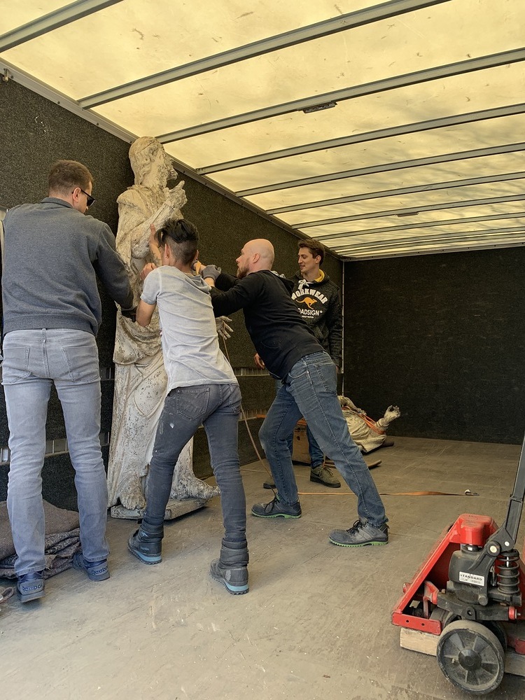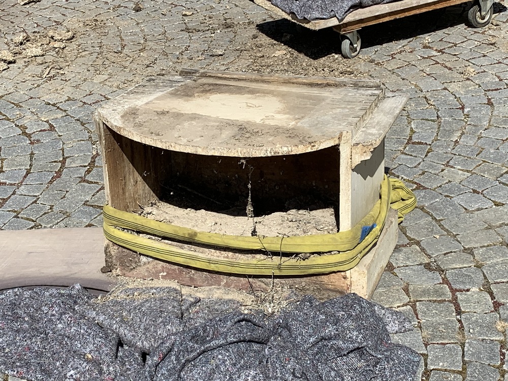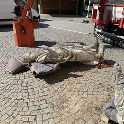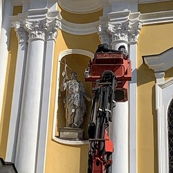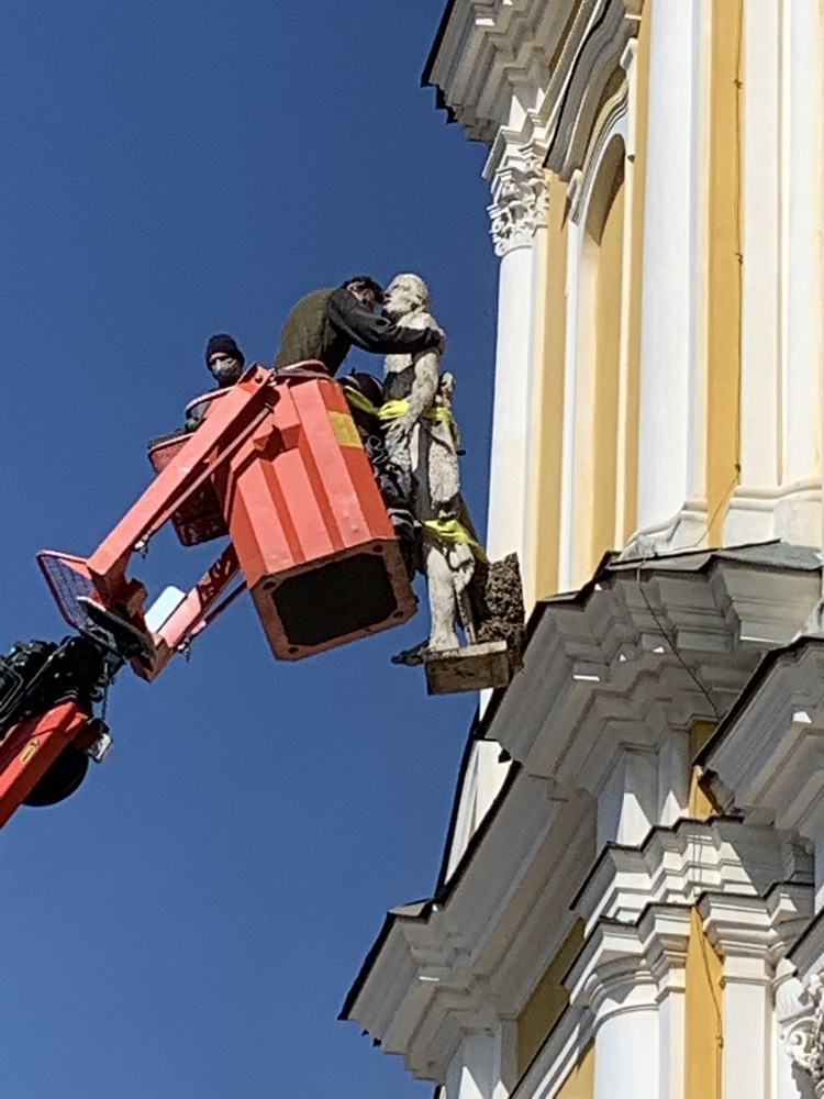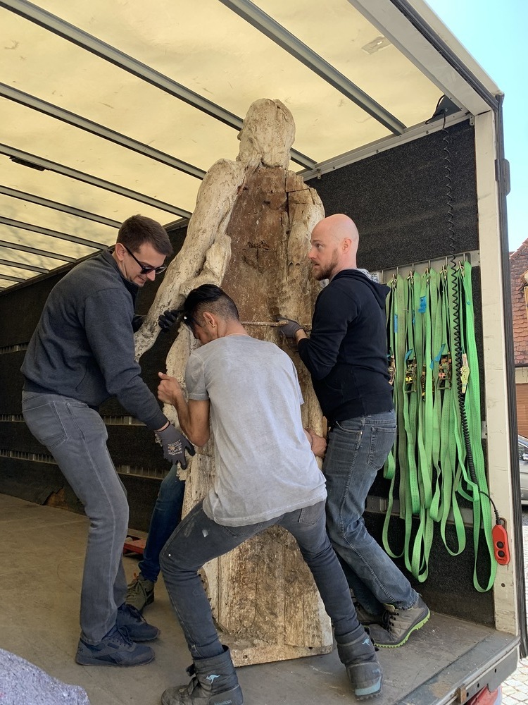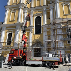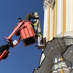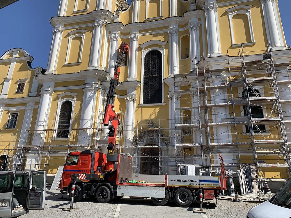 Am Donnerstag, 25.03.2021 wurden die Holzfiguren an der Fassade und die Steinfiguren über dem Hauptportal für Restaurierungsarbeiten abgetragen.
