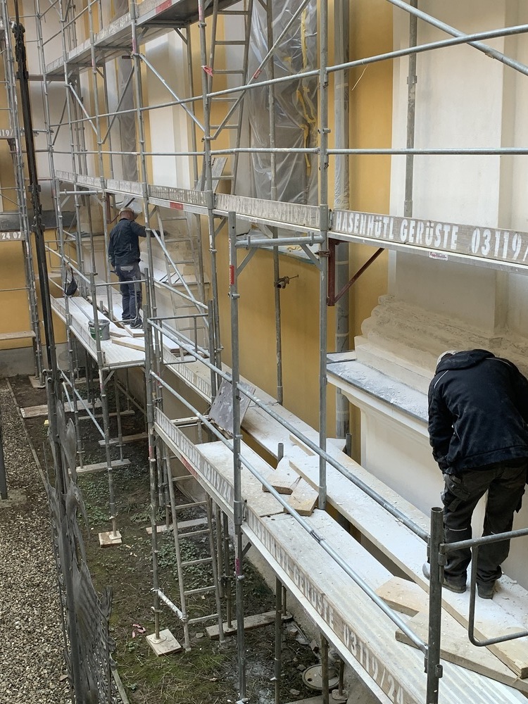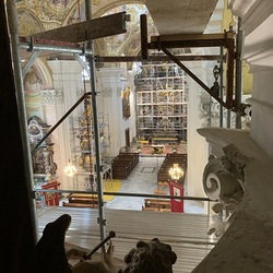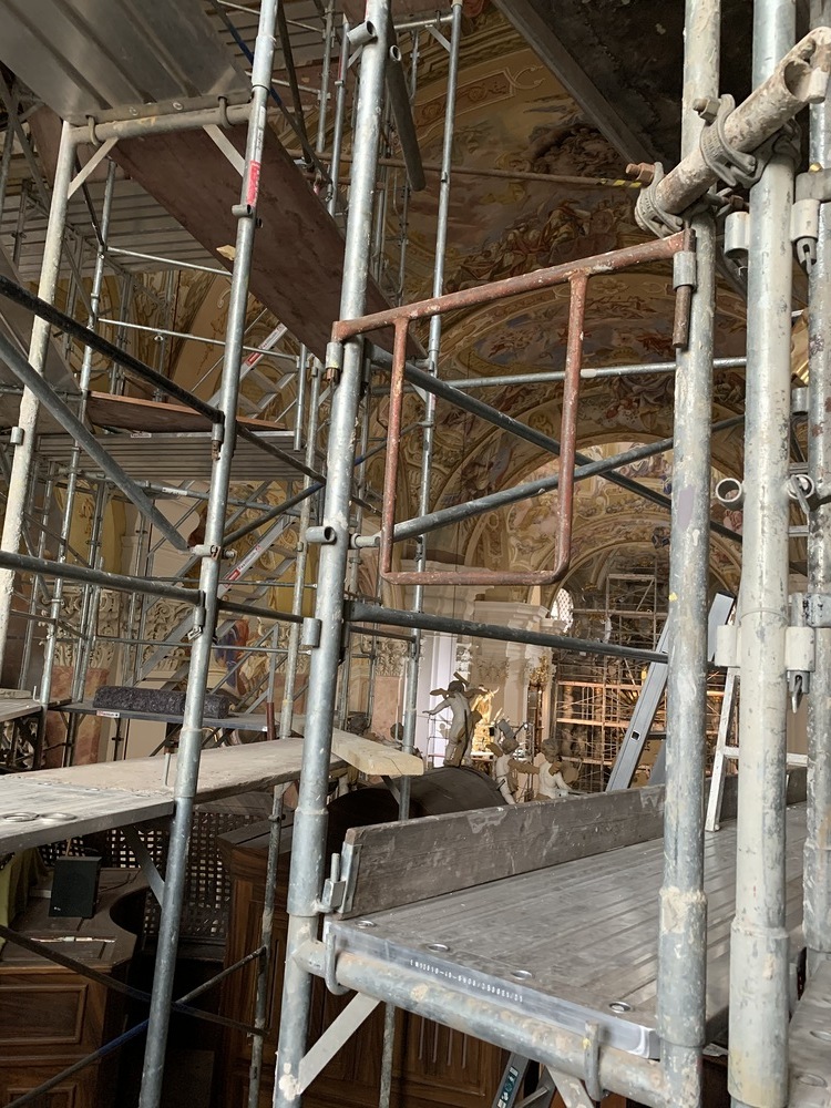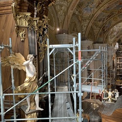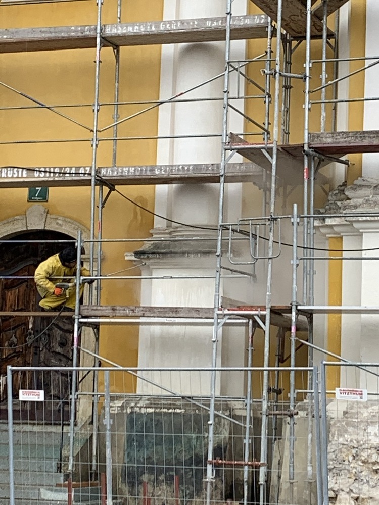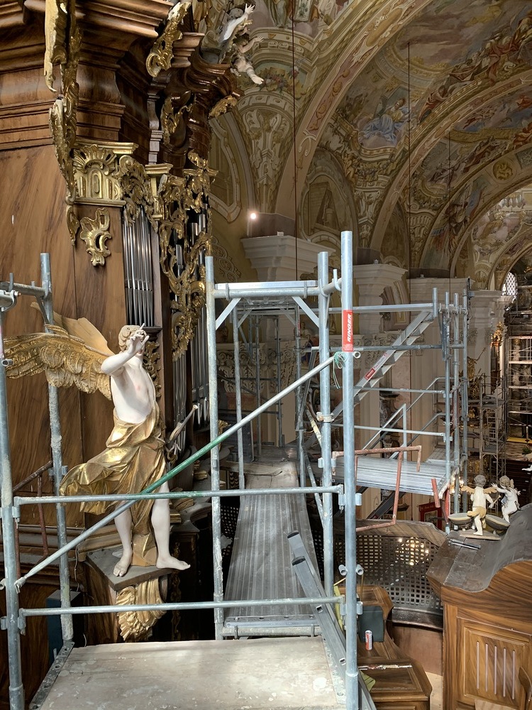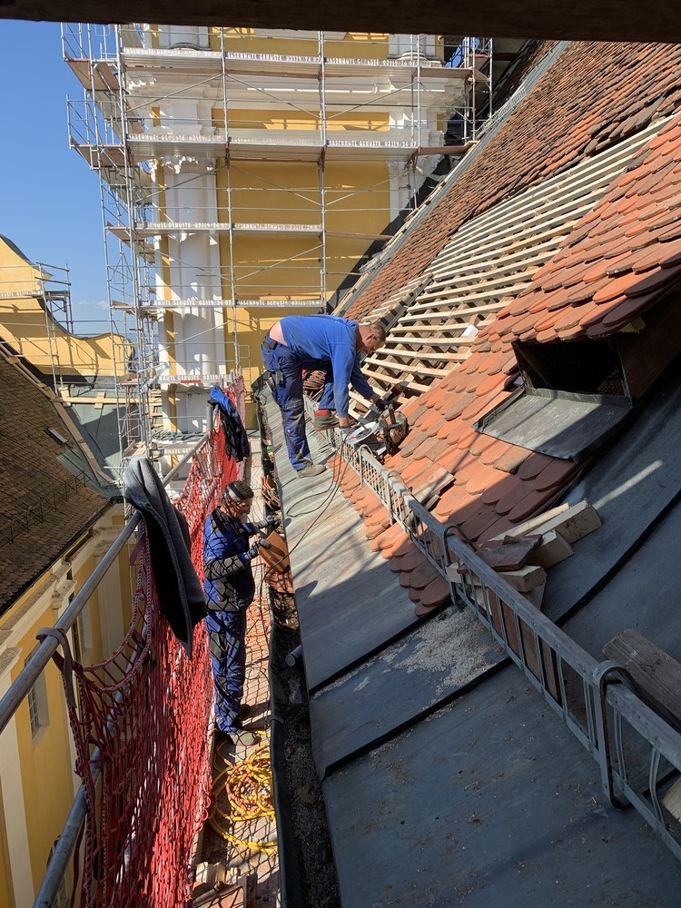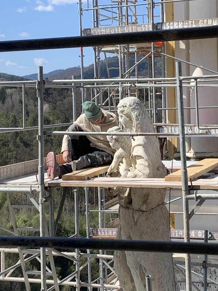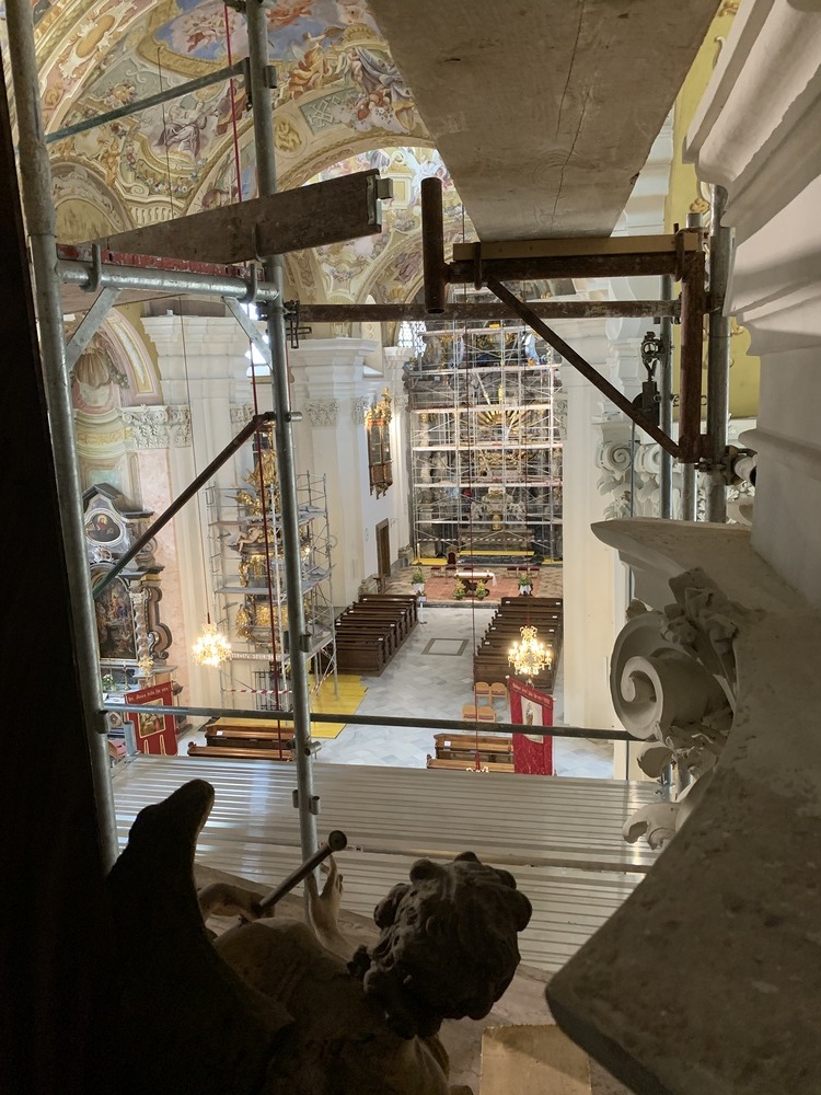 In dieser Woche waren an die 20 Personen in und um die Basilika mit Restaurierungsarbeiten beschäftigt. Gerüstaufsteller, Dachdecker, Steinmetz, Anstreicher, Restauratorinnen und Restauratoren.