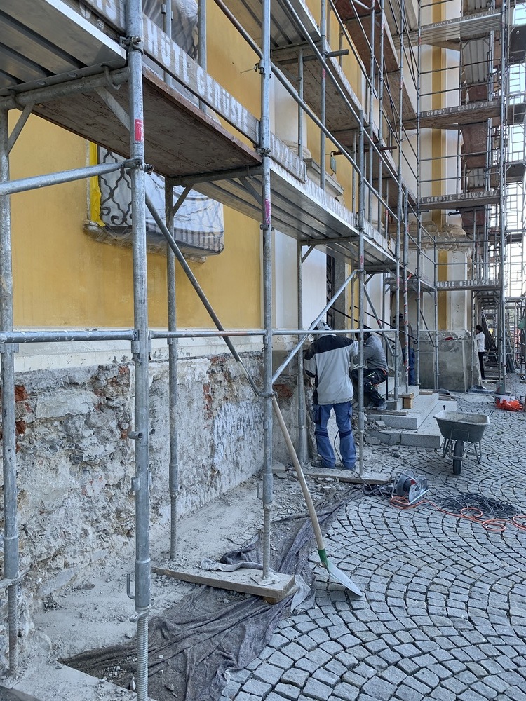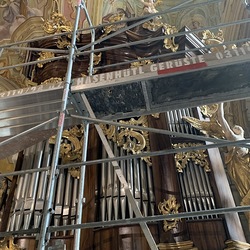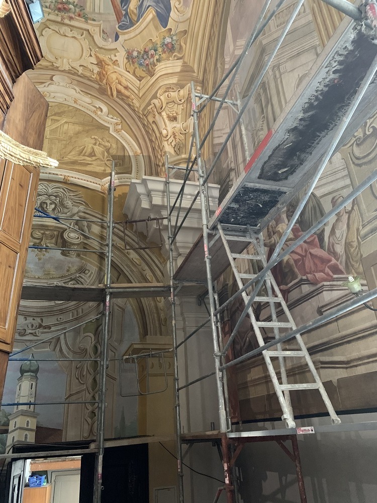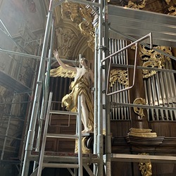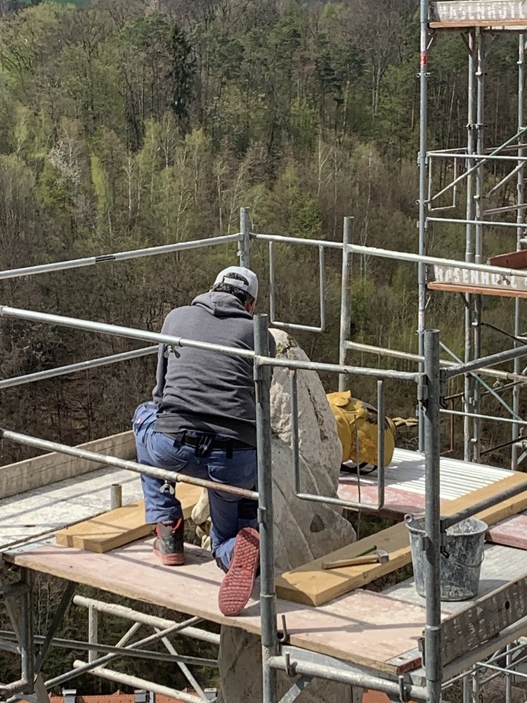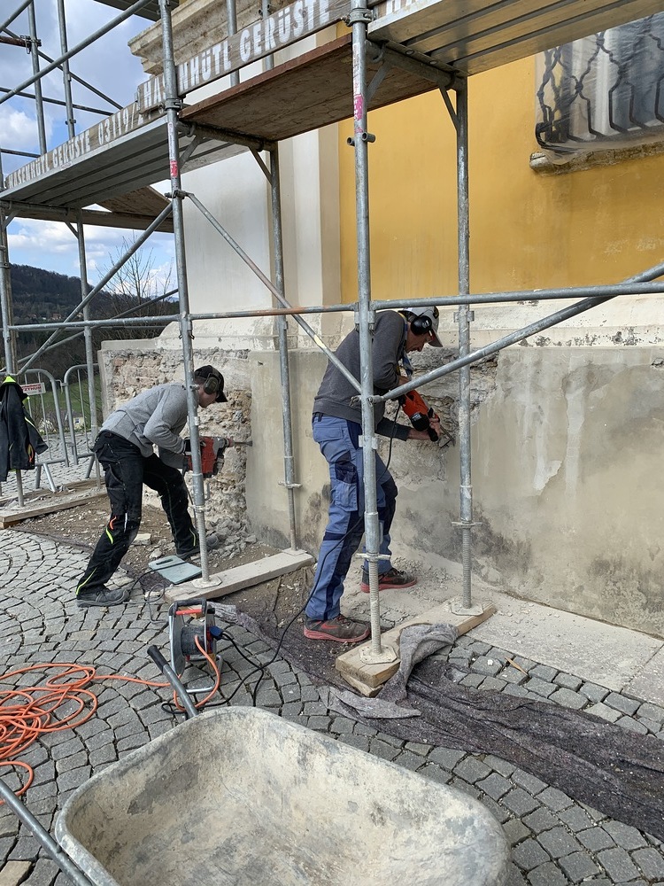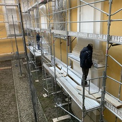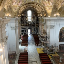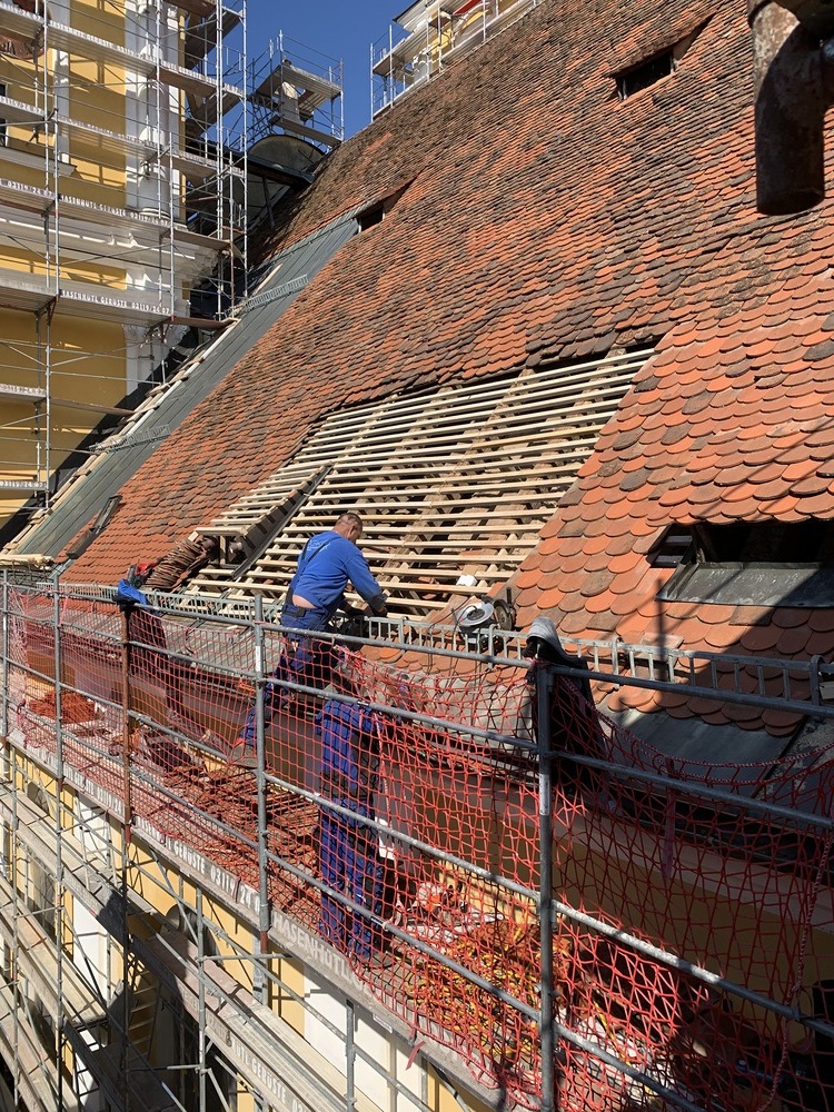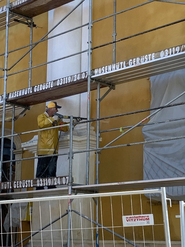 In dieser Woche waren an die 20 Personen in und um die Basilika mit Restaurierungsarbeiten beschäftigt. Gerüstaufsteller, Dachdecker, Steinmetz, Anstreicher, Restauratorinnen und Restauratoren.