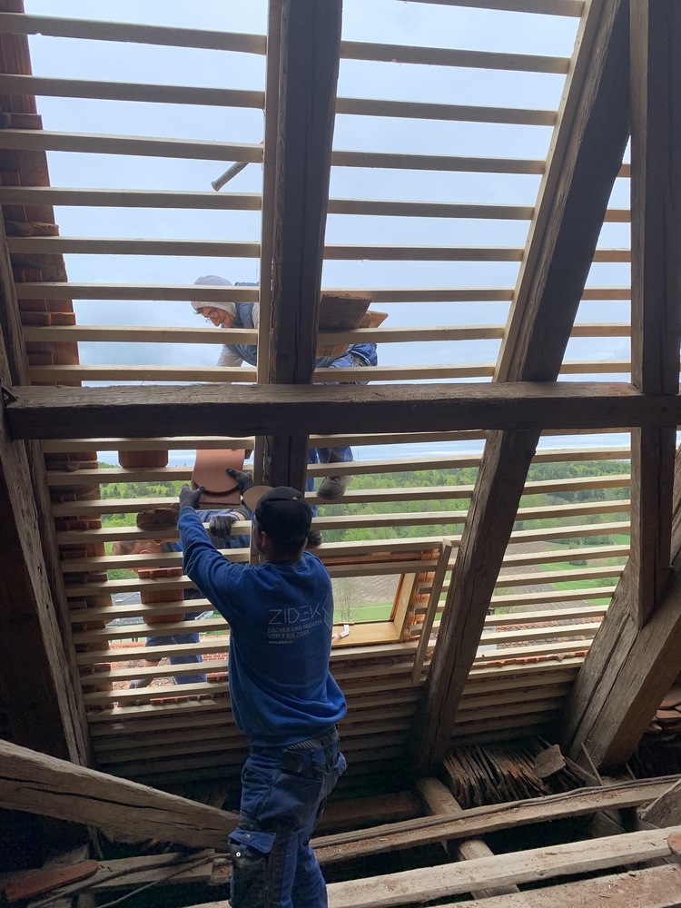Die Dacharbeiten sind voll im Gang.