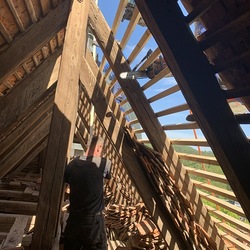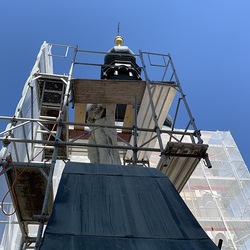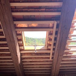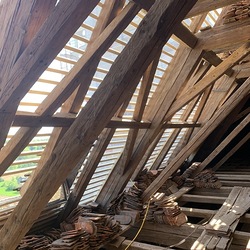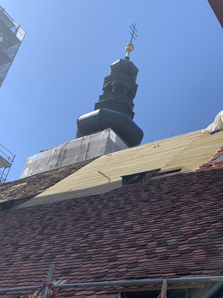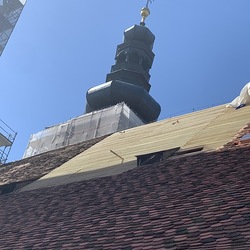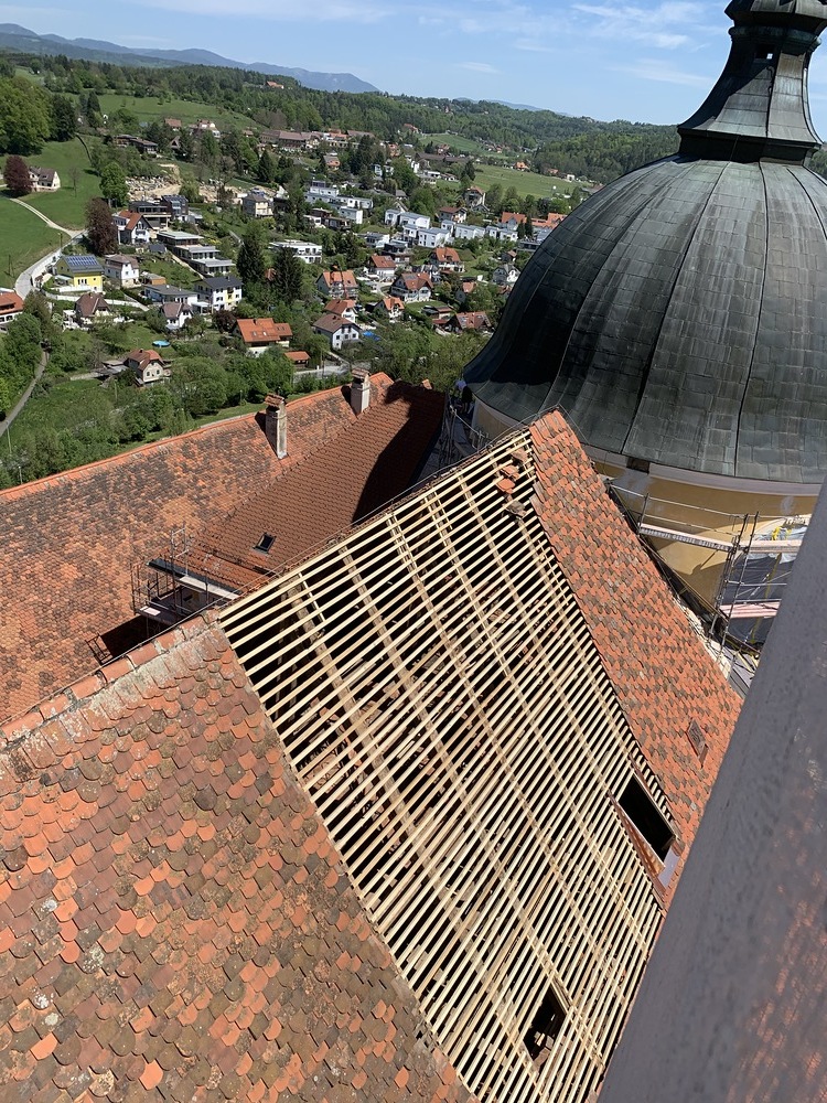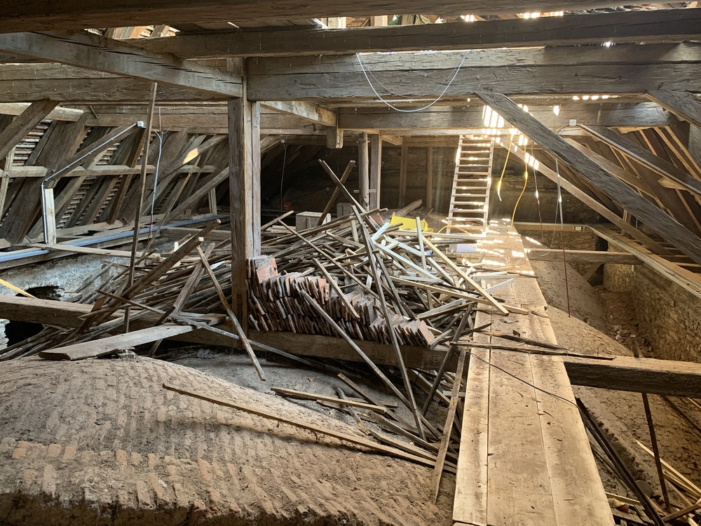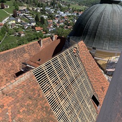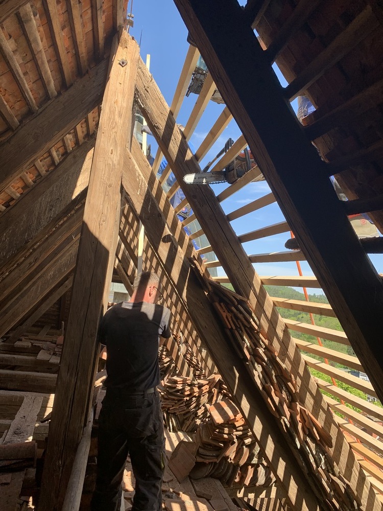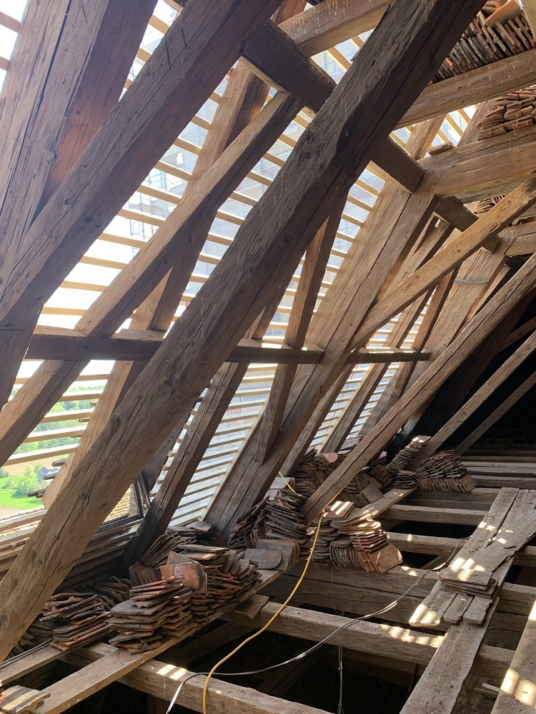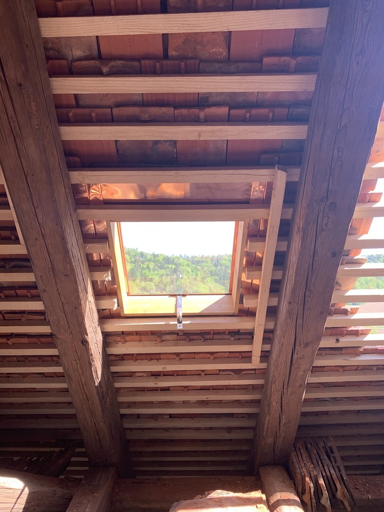 Bei den Dacharbeiten müssen die Lattungen ausgetauscht und erneuert werden. Der intakte alte Bestand der Dachziegel wird erhalten, die beschädigten Dachziegel erneuert.