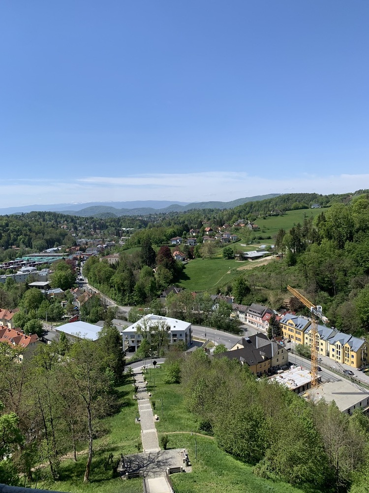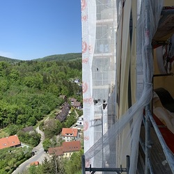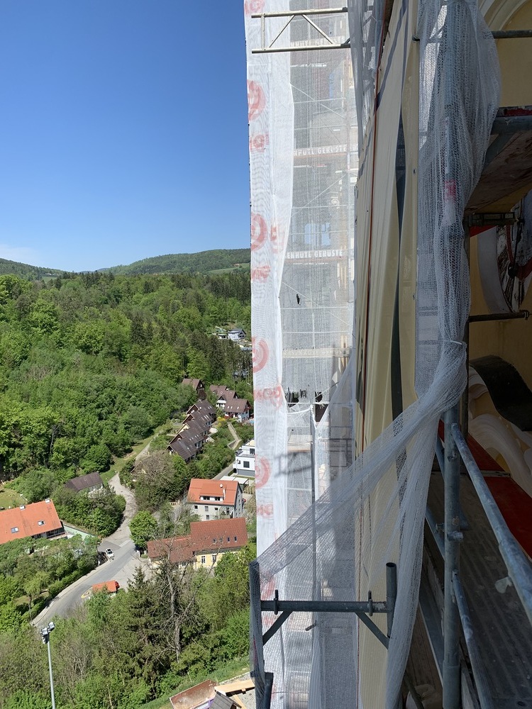 Bei den wöchentlichen Baubesprechungen geht es auch in luftige Höhen. Der Blick in die Stadt ist wunderschön!