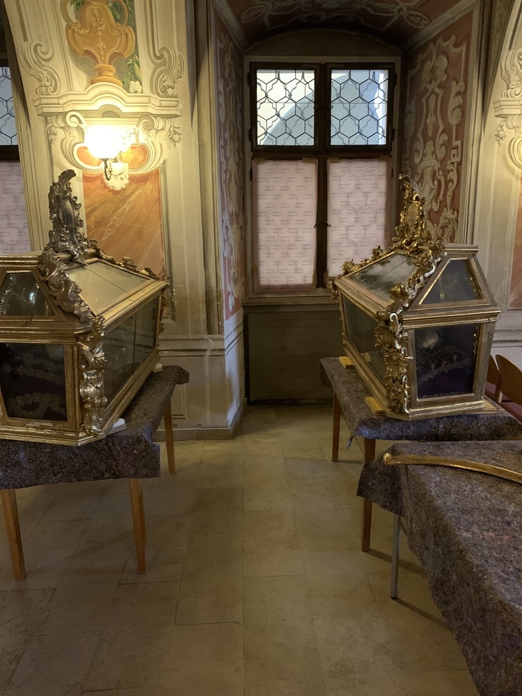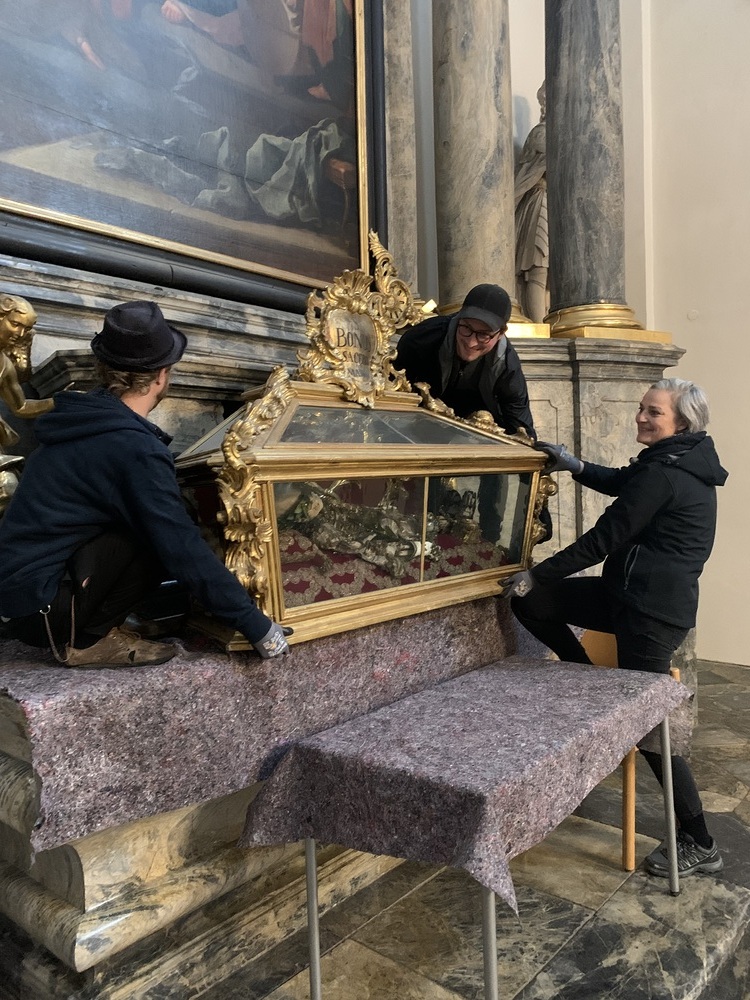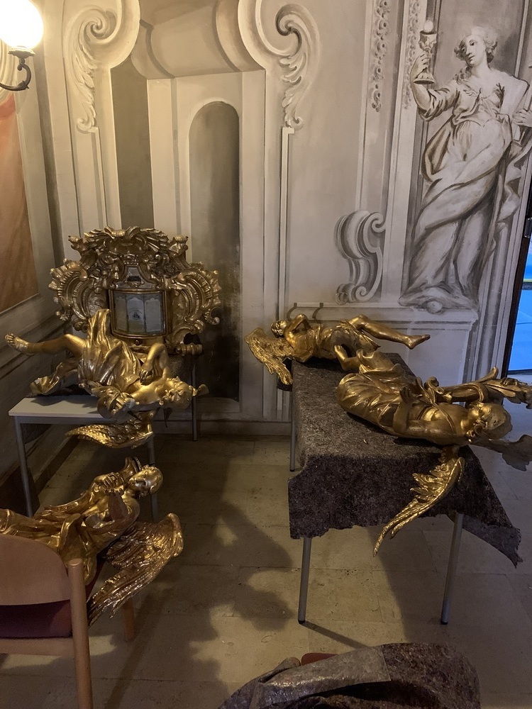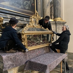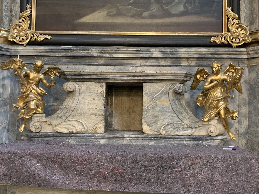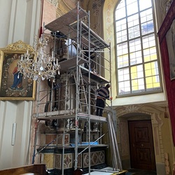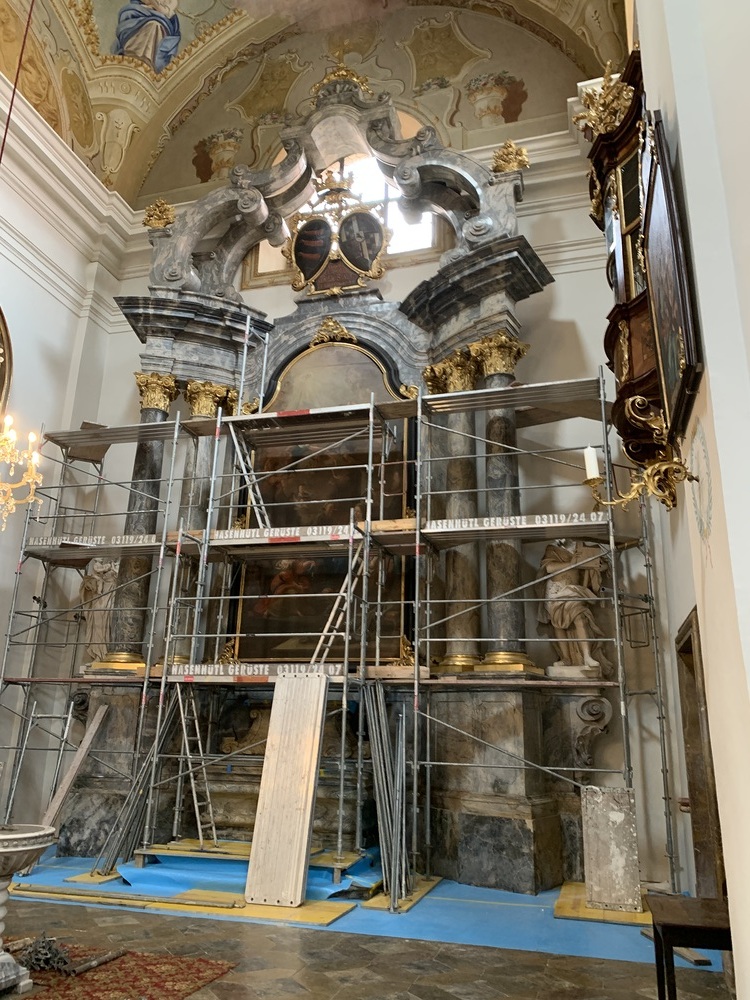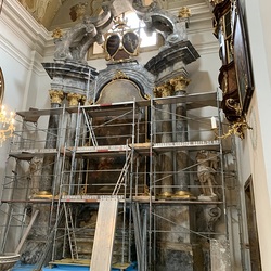 Mit Mai 2022 beginnen nun wieder die Arbeiten. Diese Woche werden in der Basilika die beiden Seitenaltäre im Querschiff und zwei kleine Altäre einerüstet.