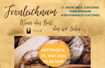 Mit unserer Nachbarpfarre feiern wir am Vorabend zu Fronleichnam, dem 29. Mai, um 18:00 Uhr, eine Eucharistiefeier zusammen mit MitarbeiterInnen des VinziMarktes. Impulse zum Thema: "Brot, Nahrung - selbstverständlich oder kostbar?"