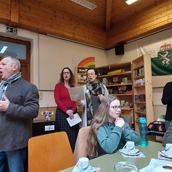 Nach dem musikalisch wunderbar umrahmten Gottesdienst begrüßten die KirchenchorsängerInnen  die BesucherInnen "mit an schean G'sang" und luden zu einem gemütlichen Beisammensein im Pfarrsaal ein.