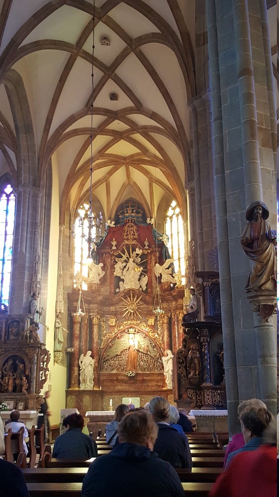 Nach zwei Stationen Bahnfahrt durchquerten wir am Sonntag das weitläufige Marburger Becken durch Auwälder mit Feuchtbiotopen und Agrarland. Unser Ziel, die Basilica minor, liegt auf einer leichten Anhöhe und war schon von Weitem sichtbar. Davor wurden wir zu Mittag von einem sehr gastfreundlichen Wirt, trotz Ruhetag, zu einer Pilgersuppe und türkischem Kaffee eingeladen.