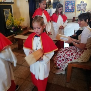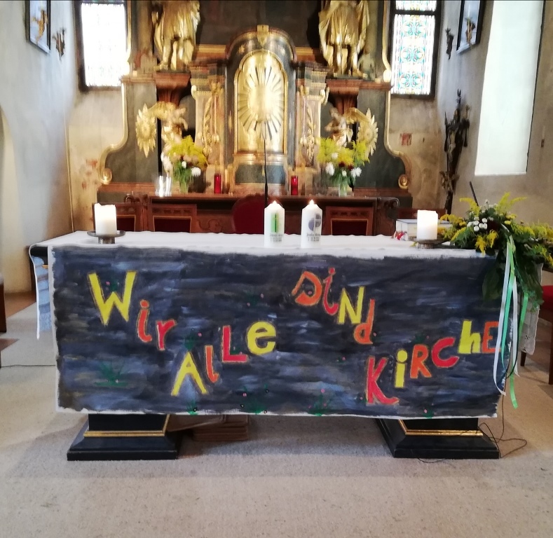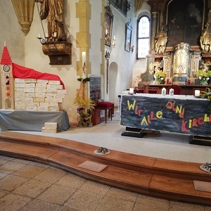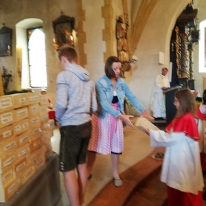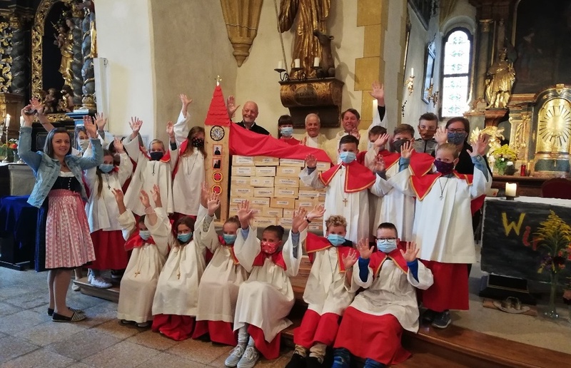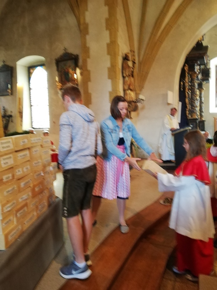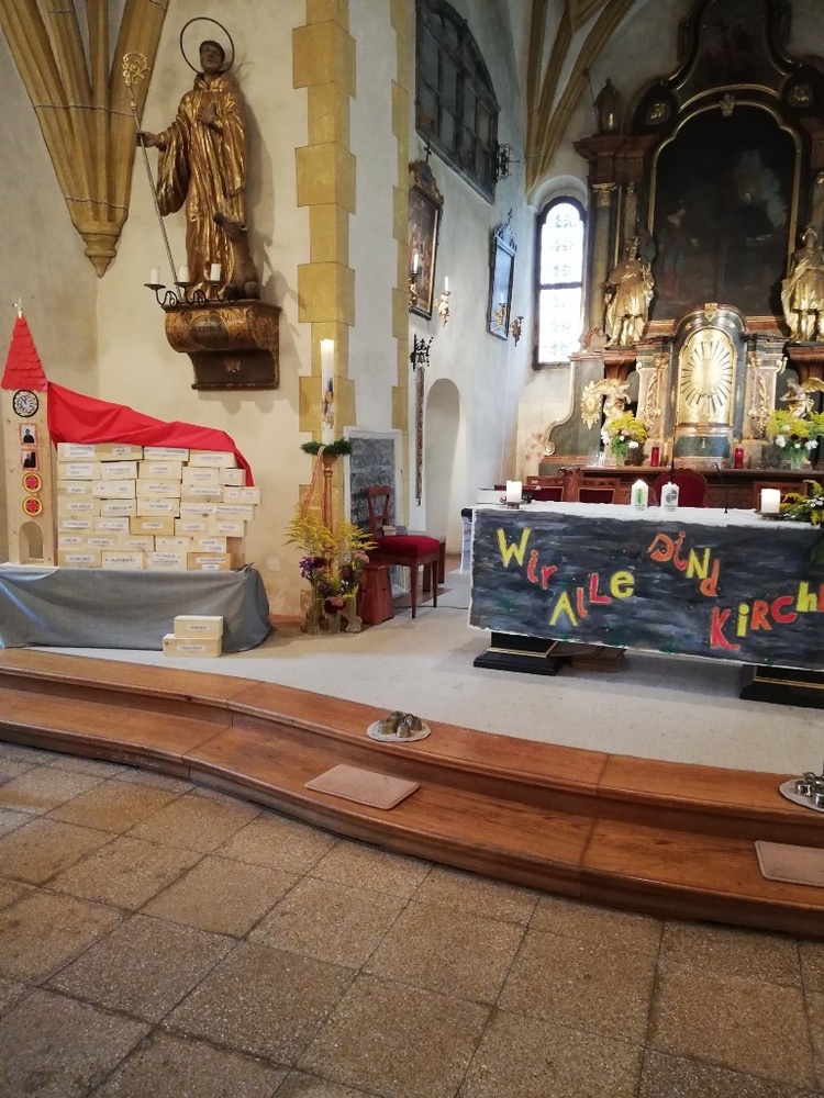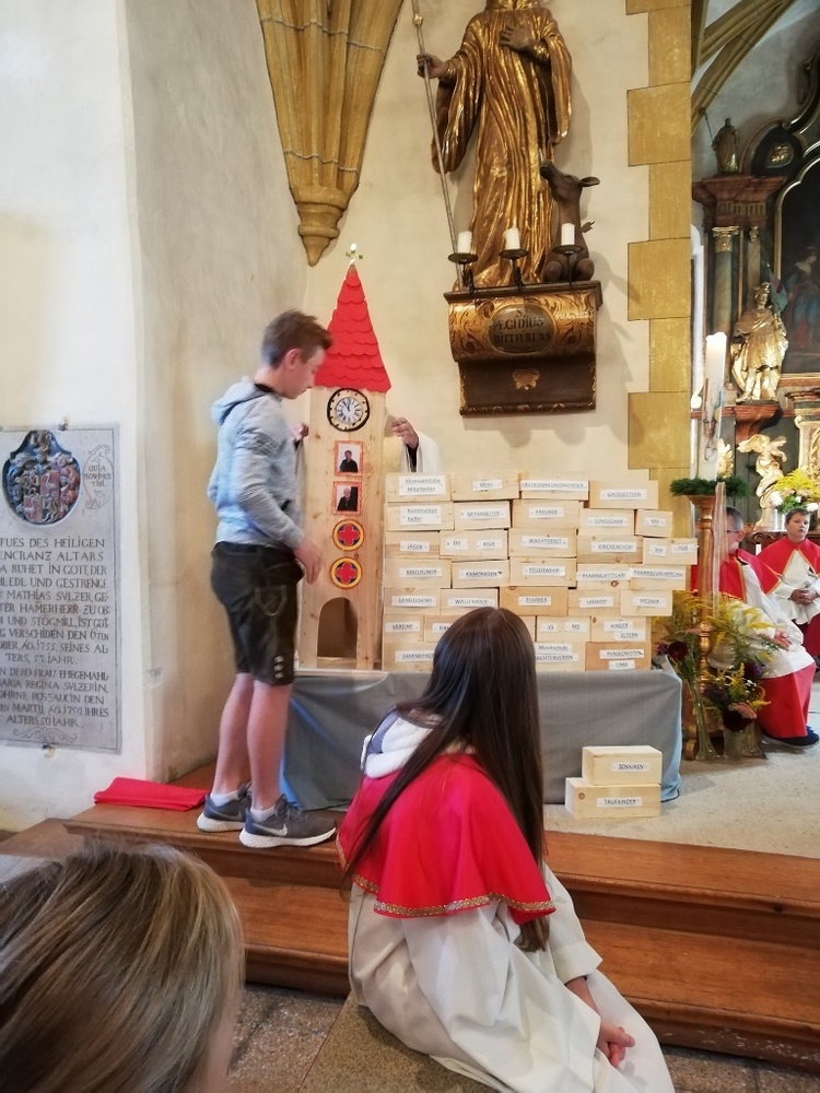 Viele unserer Ministranten zogen mit Bausteinen für unsere selbstgebaute Kirche ein. "Wir alle sind Kirche"-" Wir bauen heute unsere Kirche"- An Stelle der Lesung gab es Träume."Ich träume von einer Kirche......" Im Evangelium sprach Pfarrer Mag. Schäfmann davon, "Das Ganze ist mehr als die Summer der Teile", während dessen die Minis mit der Jugend die Kirche für uns alle fertig bauten. Im Anschluss an den Festgottesdienst gab es eine Agape und einen Kekseverkauf, organisiert in bewährter Weise vom Pfarrkirchenrat.