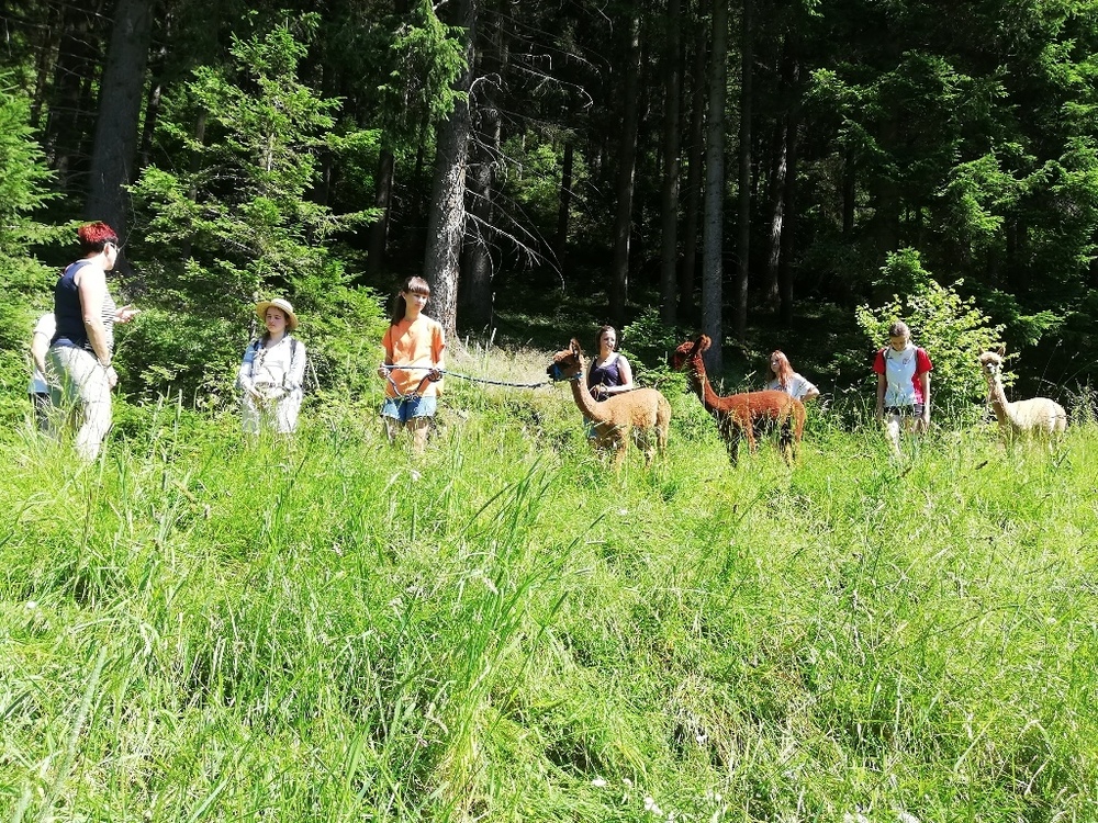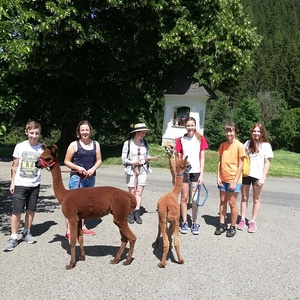 Gemeinsam mit dem Rad fuhren wir zum Hof der Familie Strasser vlg. Leikam in Schwarzenbach, wo die Alpakas "Karli, Clemens und Ingo" schon auf die Jugendlichen warteten.
