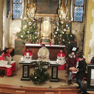 Im Kyrie wurde von den Ministranten die Vorbereitung auf das Fest Weihnachten, die Geburt Christi, gesprochen, was alles für die Ankunft des Herrn zu tun ist. Statt der Predigt konnte die Jungschar eine Geschichte vom "werdenden Christbaum" gestalten. Baum - Lametta, Kugeln, Sterne und Kerzen trugen zum Glanz bei.