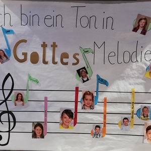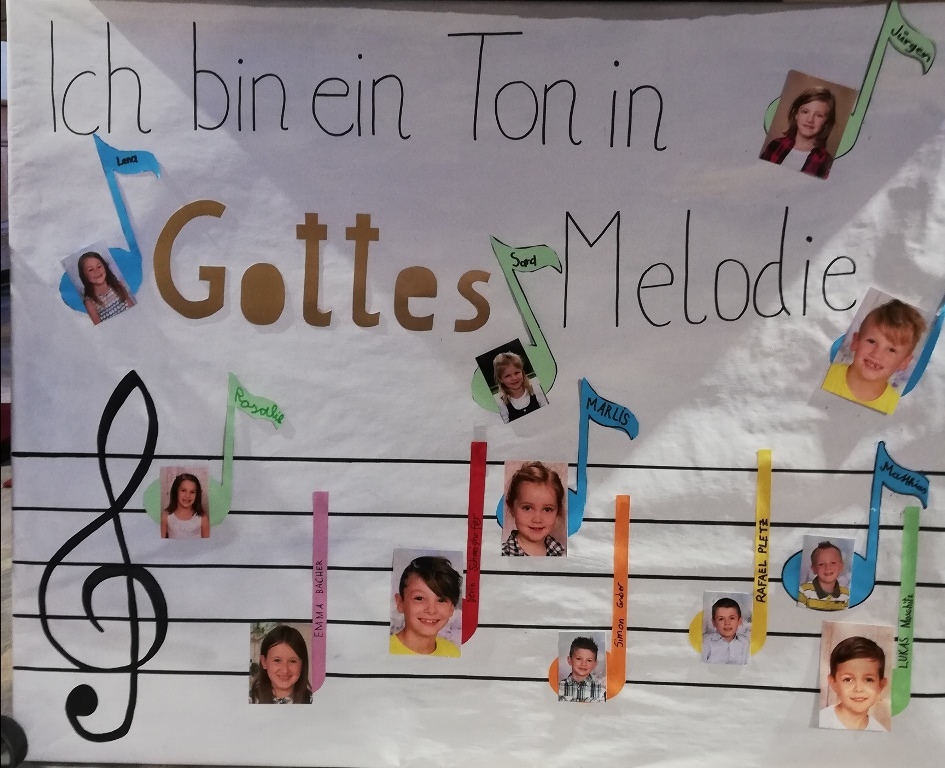 Thema der diesjährigen Erstkommunion ist "Du bist ein Ton in Gottes Melodie"- welches in in der Vorbereitung auf das Fest , mit Religionslehrerin Katharina Fritz, und im Gottesdienst mit Mag. Heimo Schäfmann die Einzigartigkeit jedes Tones - jedes Kindes hervorhebt. Musikalisch umrahmt wurde die Feier von Julia Staubmann.