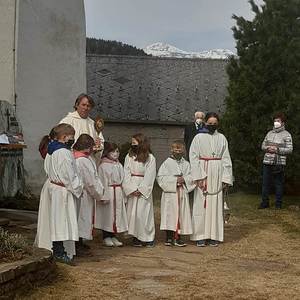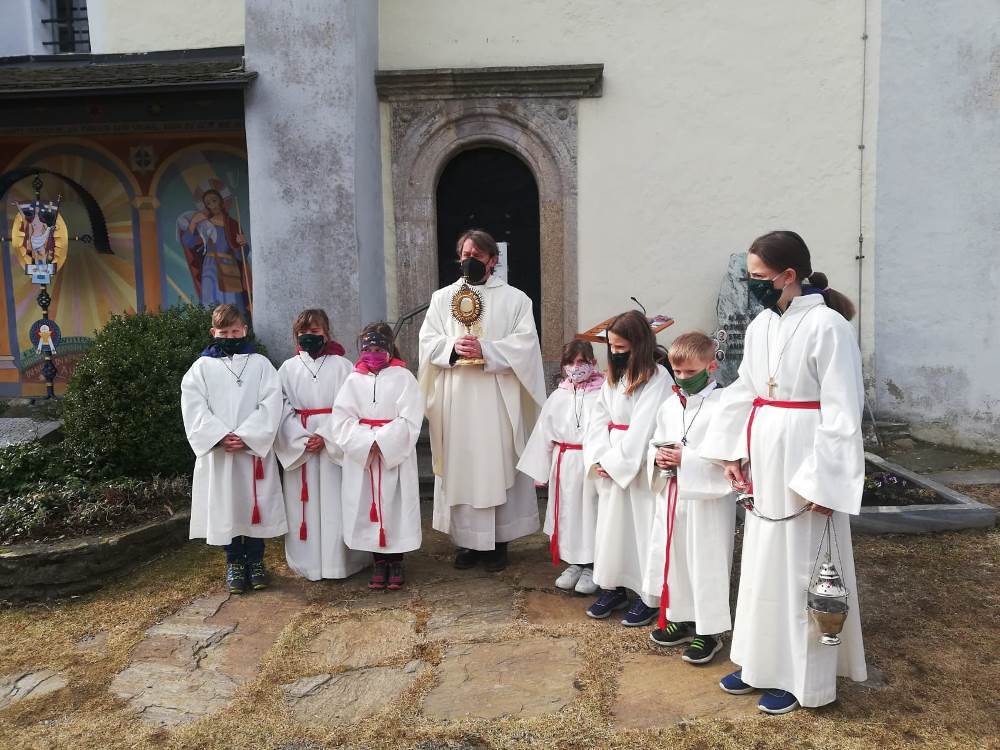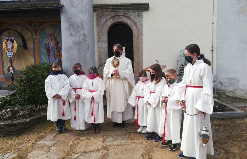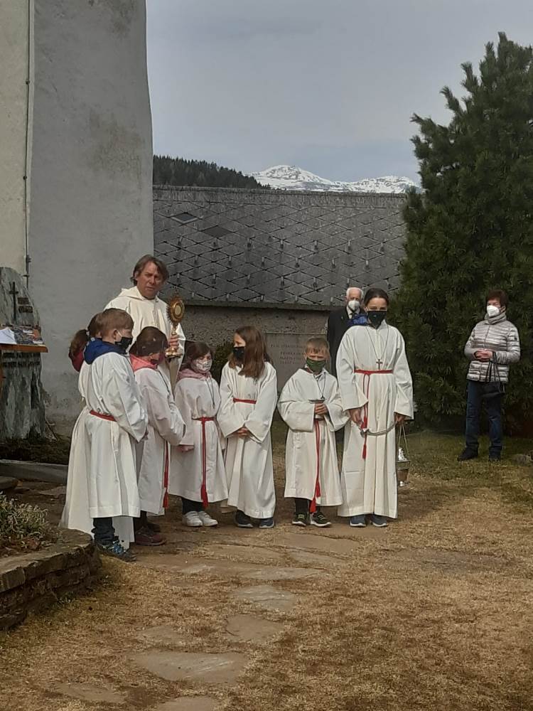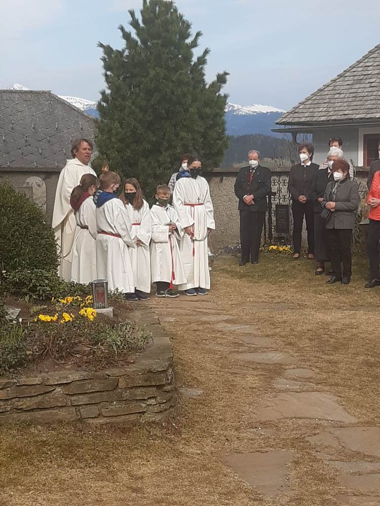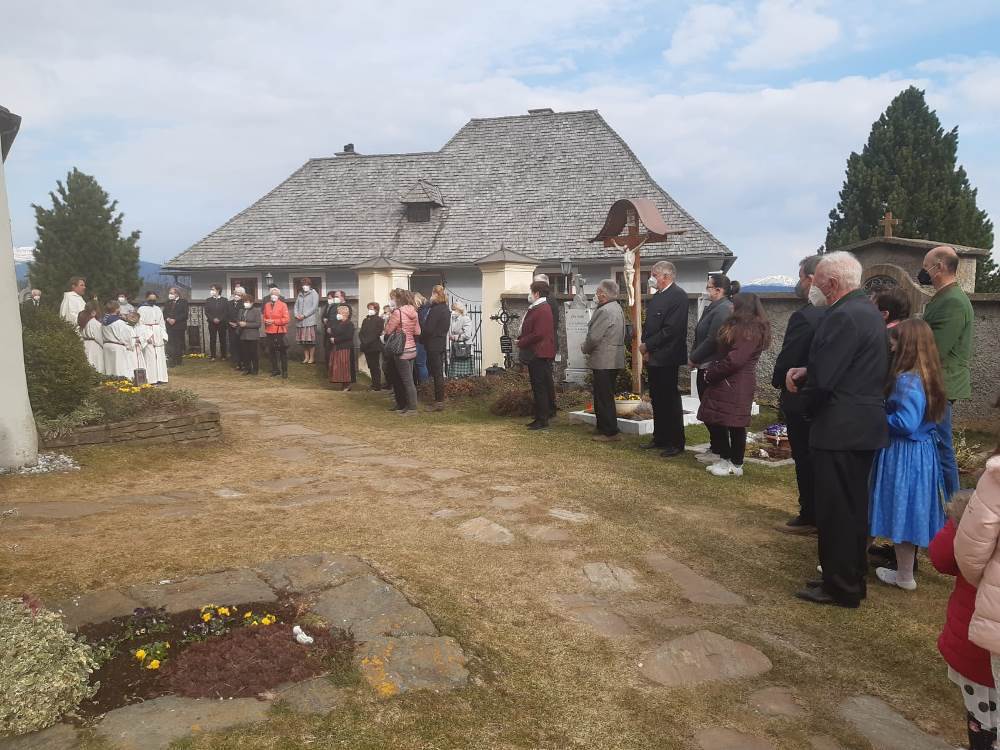 Pfarrer Mag. Heimo Schäfmann feierte mit den Gläubigen die Hl. Messe. Da am 25 April auch immer eine Markusprozession stattfindet wurde im Anschluss vom Gottesdienst eine kleine Prozession um die Kirche gemacht mit anschließendem Schlusssegen.