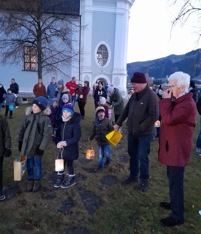 Obdacherlandes am 11.11.2021 erleben. Viele Lichter, viele Zeichnungen der Kinder der VS und MS sowie viele Kinder mit bunten Laternen besuchten den Hl. MARTIN am Platz vor dem Kriegerdenkmal.