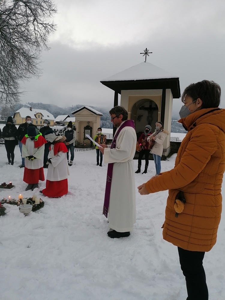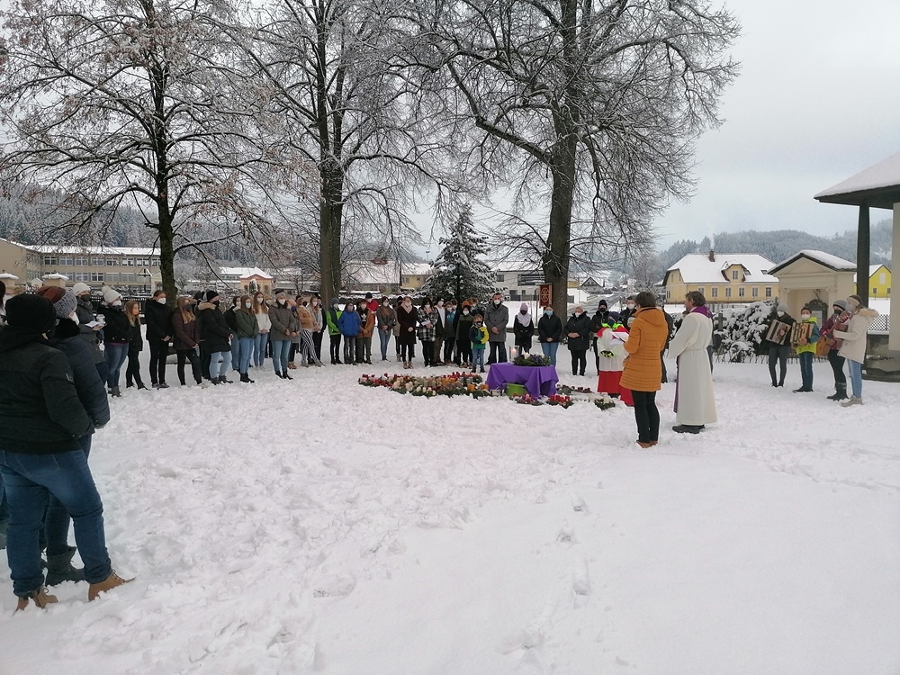 Covidbedingt gestaltete jeder Firmling zu Hause selber den Adventkranz. Eine gemeinsame Segnung mit Pfarrer Mag. Heimo Schäfmann feierte die Firmlinge und deren BegleiterInnen heute Samstag, 27. 11.2021 unter Einhaltung der aktuellen Bestimmungen auf dem Platz vor dem Kriegerdenkmal.