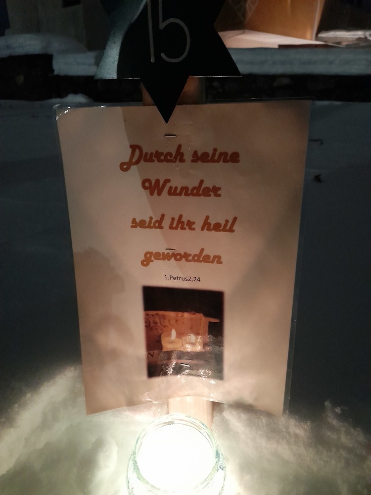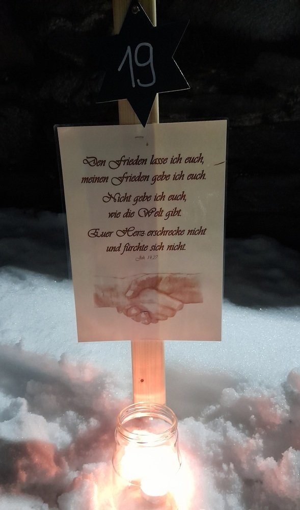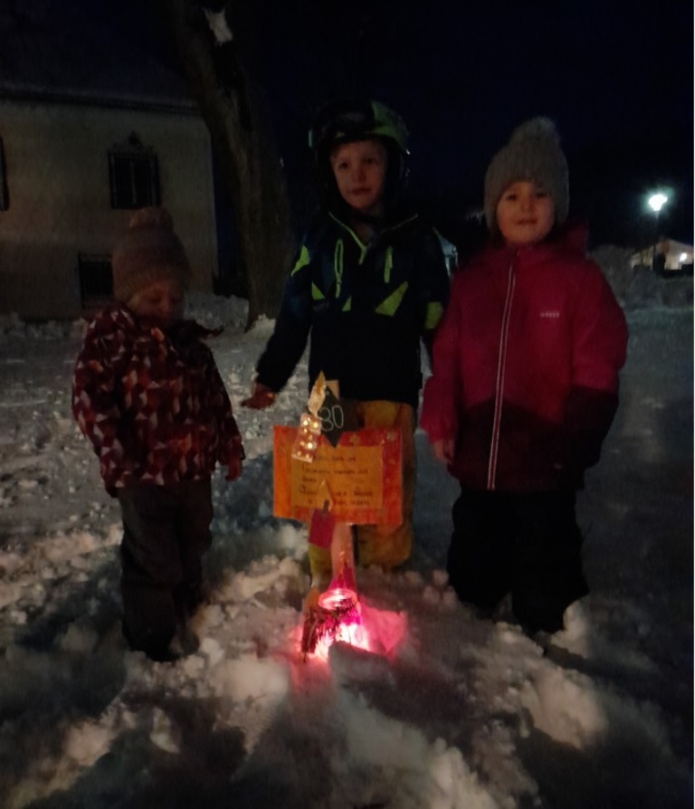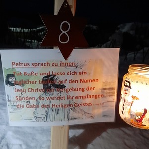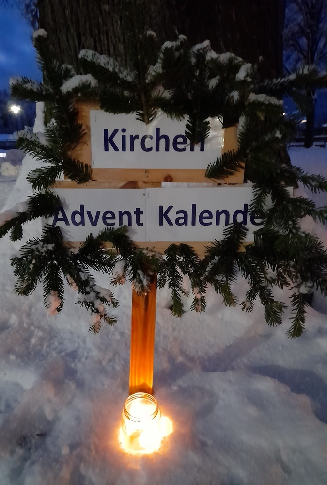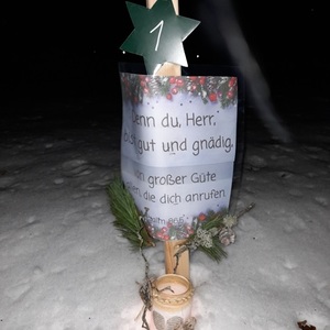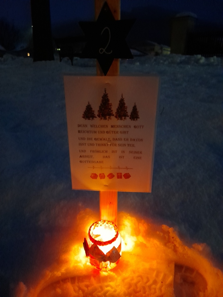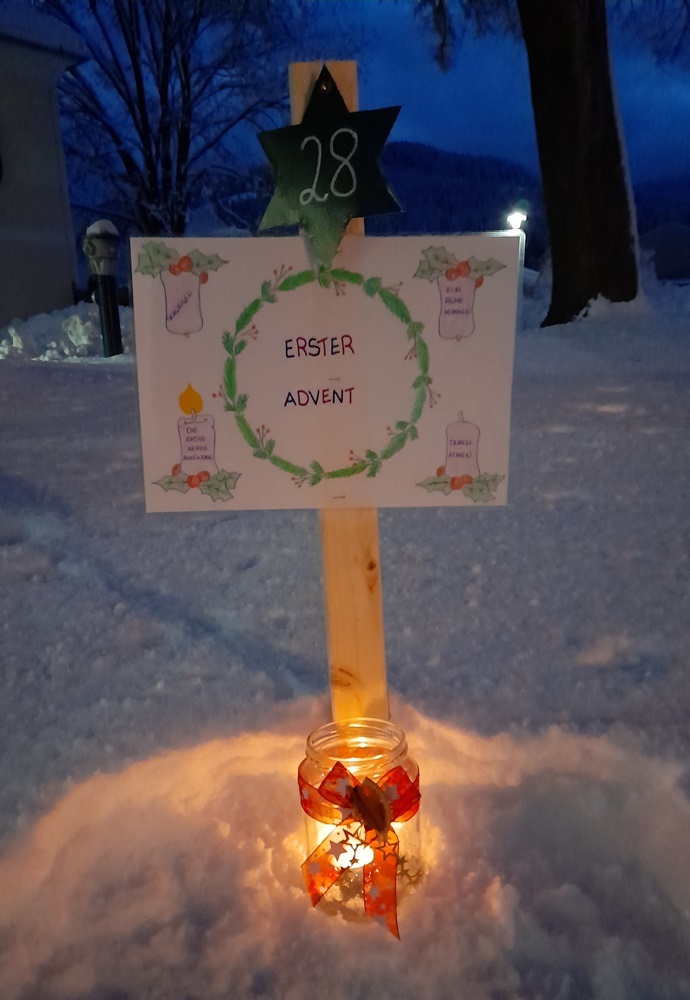 Am 1.Advent wurde um 17.00 Uhr rund um unsere Pfarrkirche ein "Pfarradventkalender" begonnen. Täglich um die gleiche Uhrzeit wird ein Pfarrmitglied/Familie einen Beitrag auf einen dafür vorgegebenen "Holzpflock" anbringen. Ebenso wird bei jedem schon vorhandenem Beitrag ein Licht entzündet. So entsteht ein immer heller werdender Weg auf Weinachten hin.